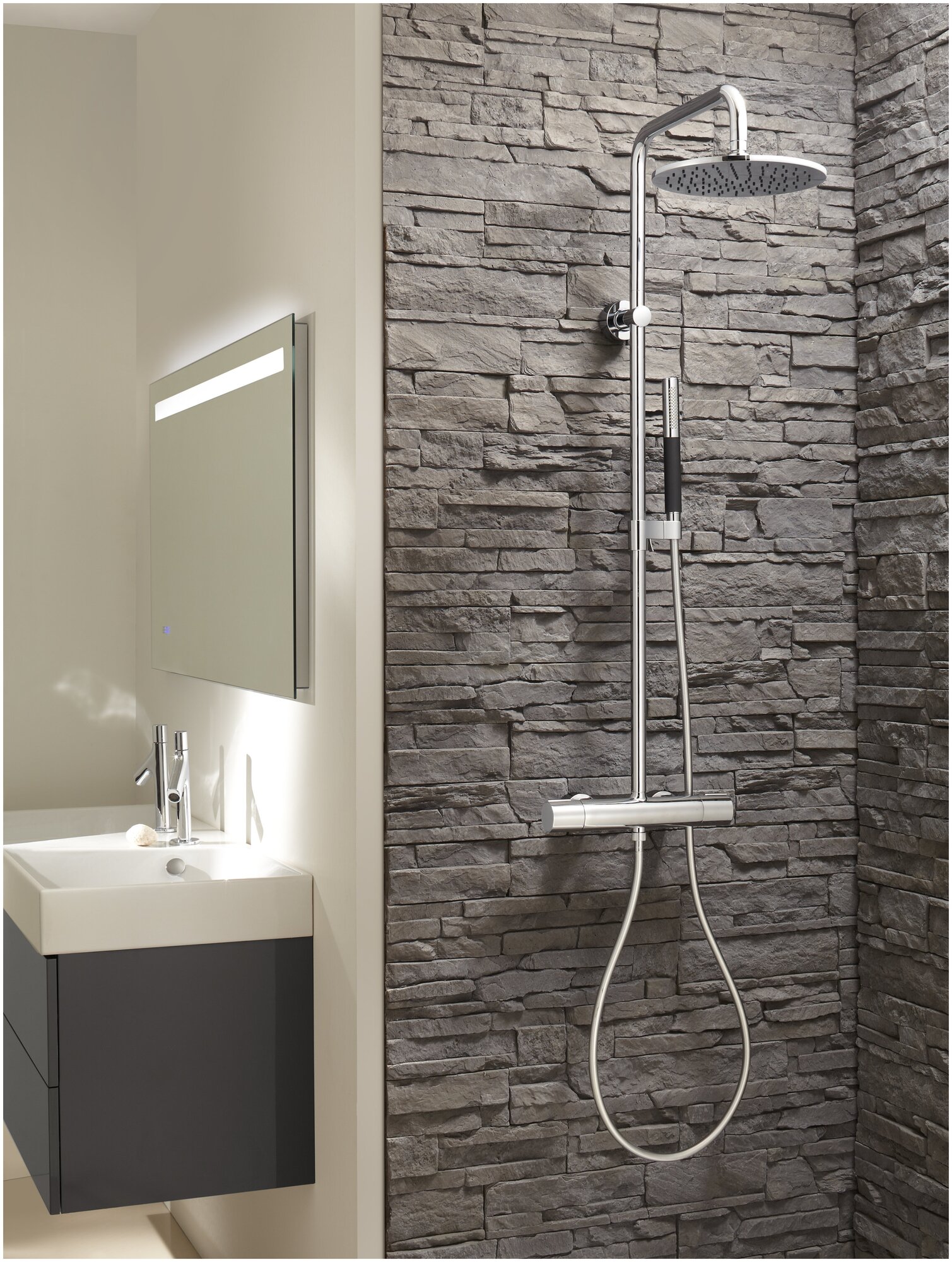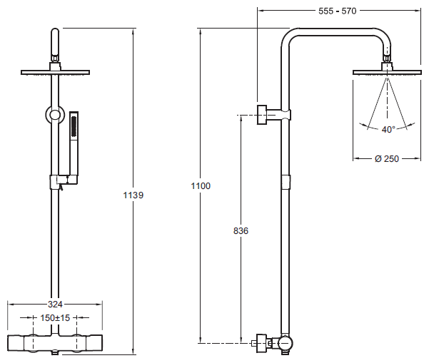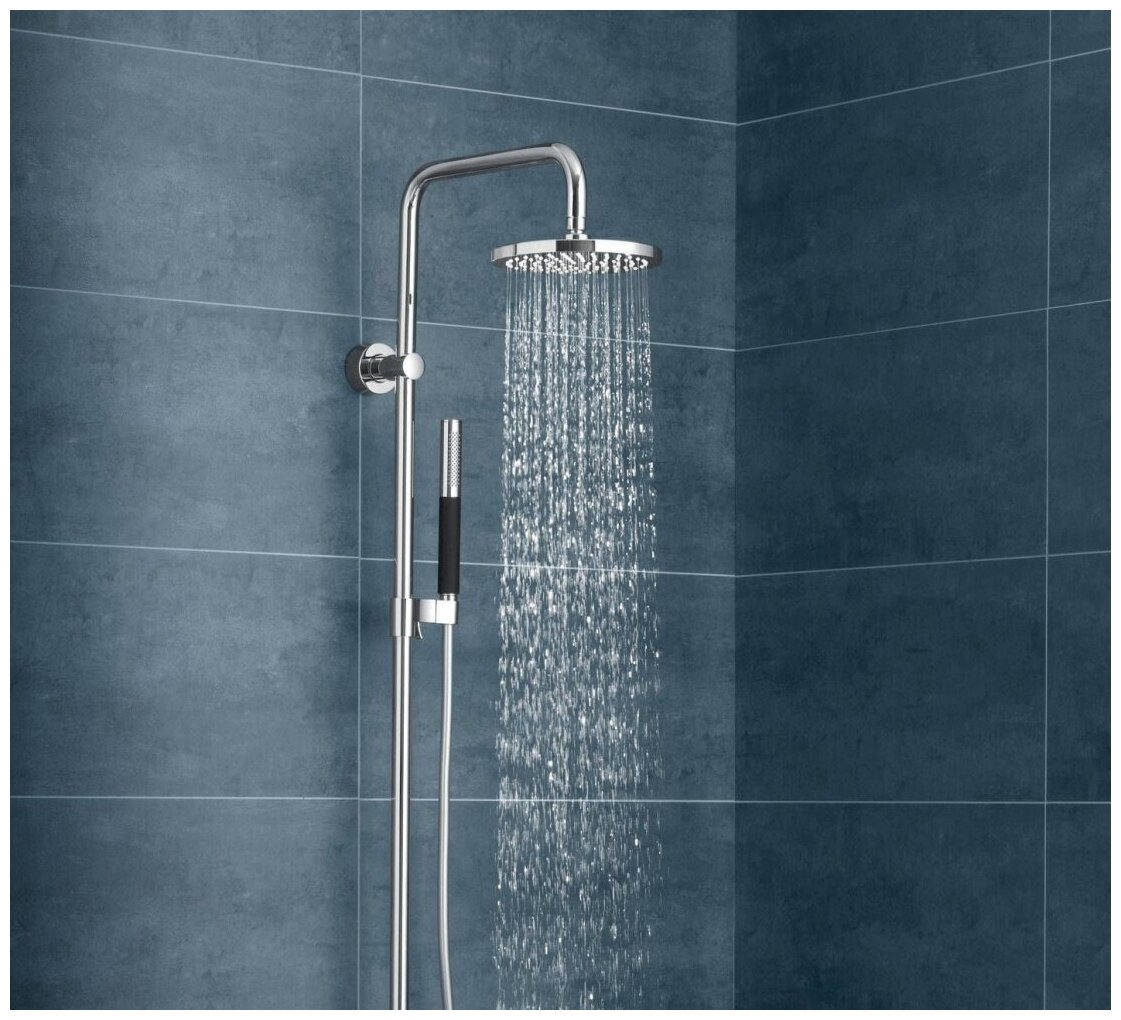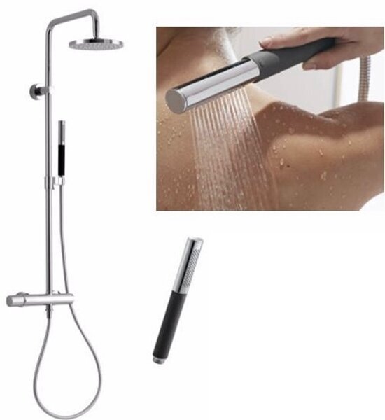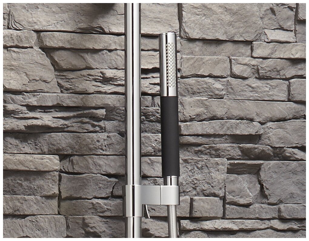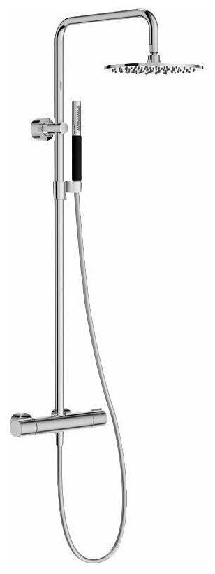 Душевая стойка из хромированной латуни выполнена в современном стиле. Укомплектована термостатическим смесителем и металлическим круглым верхним душем, диаметром 250 мм и гибким нескручивающимся шлангом. Также имеется ручная лейка Shift Ellipse 2-х режимная. На ручке контроля расхода воды находится переключатель режимов. Максимальная температура воды составляет 50°. Высота стойки 113,9 см.