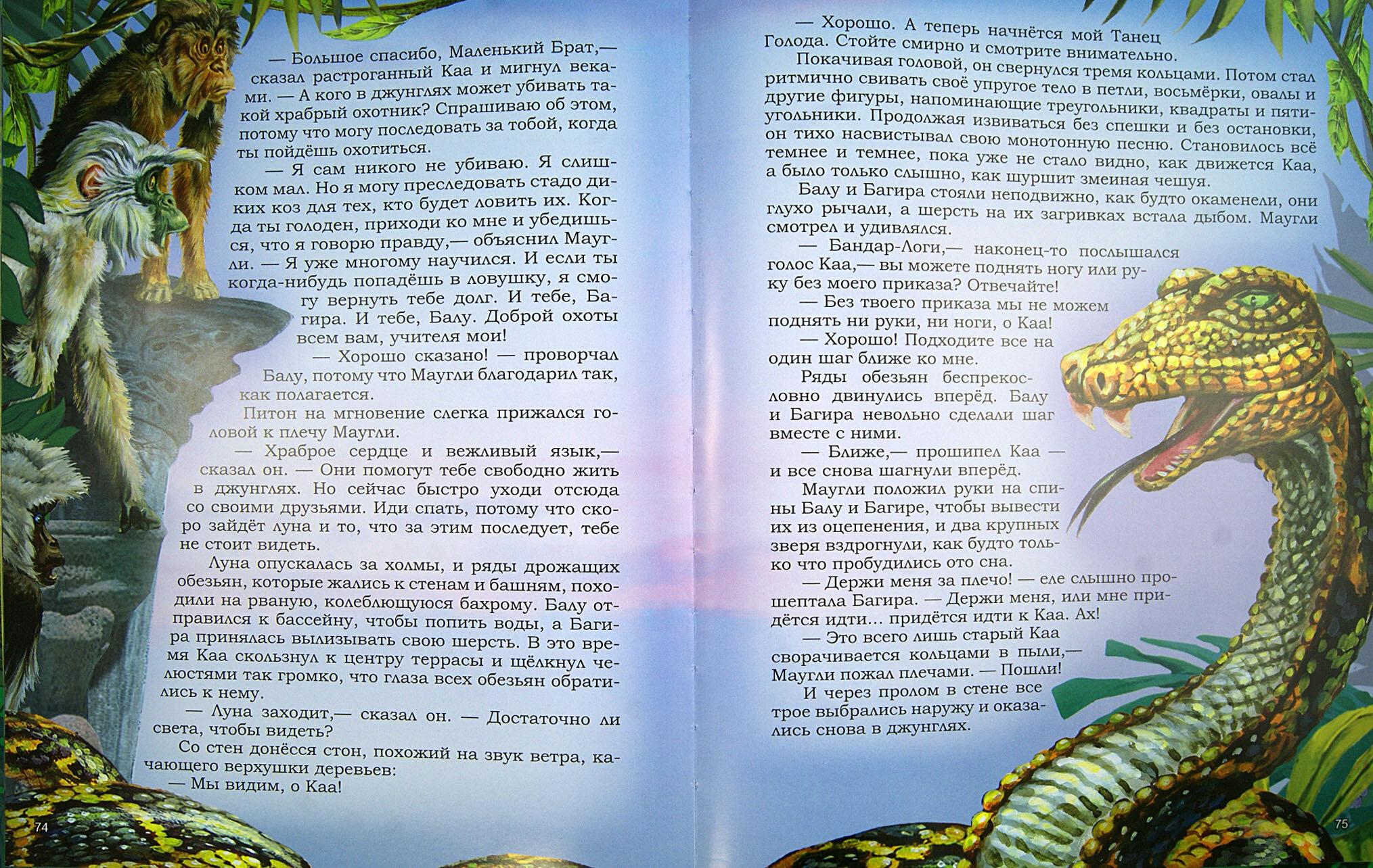 Сравнивала 3 книги "Маугли" (2 другие прокладываю в виде ссылок). Эта из 3-х лучше всех иллюстрирована. Хорошие иллюстрации.