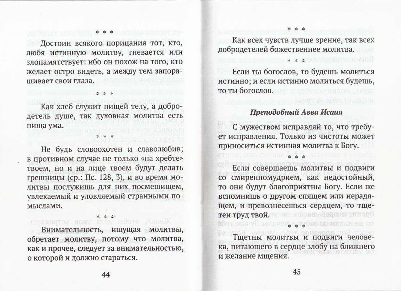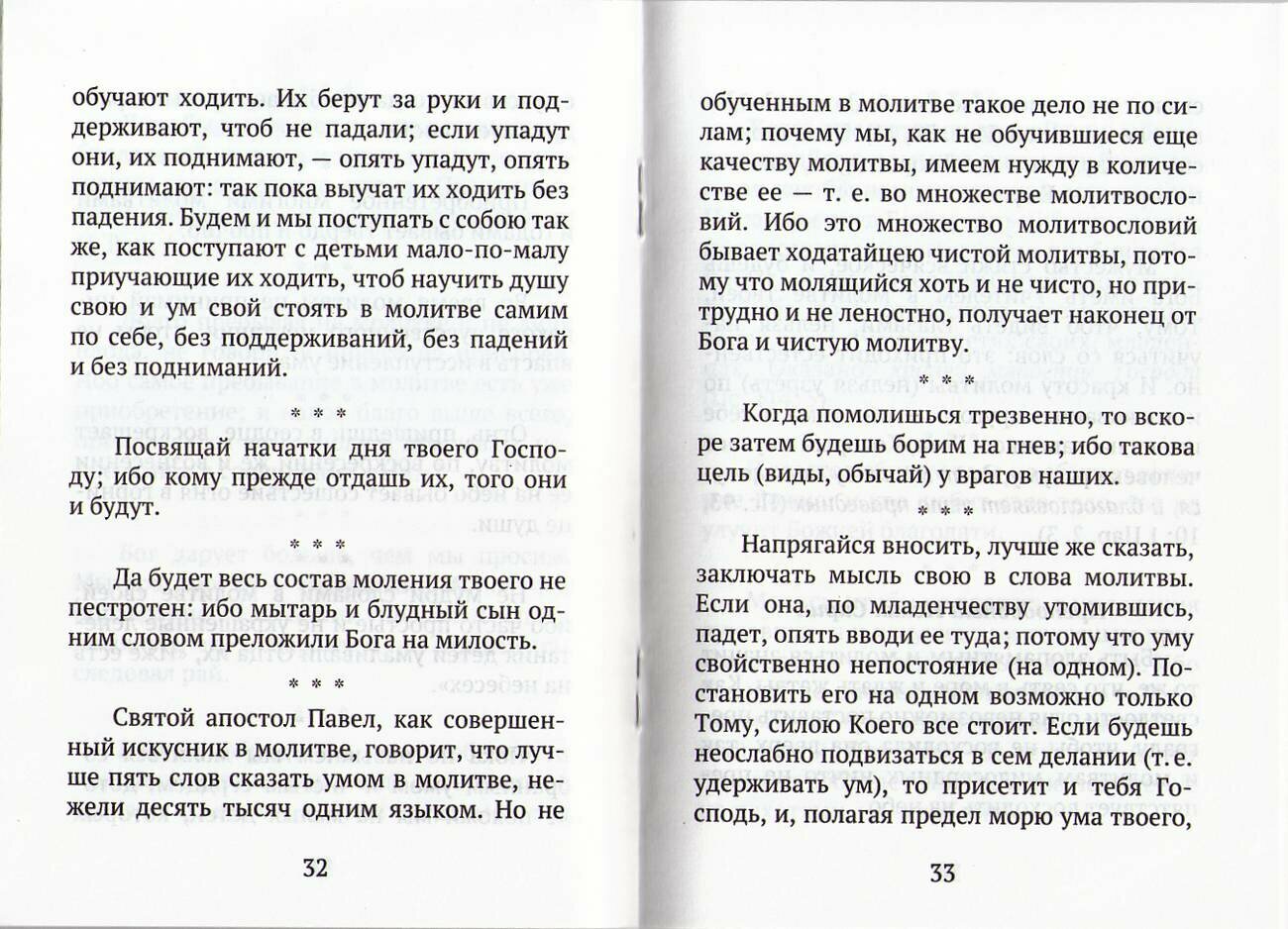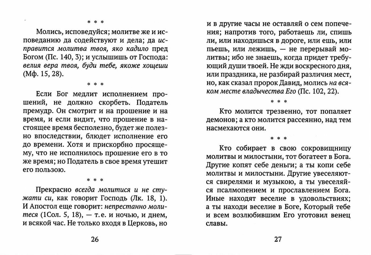 Книга хороша для новоначальных христиан,будет способствовать преуспеянию подвижника,но надо помнить,что без Бога невозможно и малейшее преуспеяние.Хорошо собирает мысли и настраивает на добрую жизнь:как утром,так и вечером,ведь тема одна из главных в духовной жизни:молитва.Кто не увидит в этих поучениях нового,тот невнимательно их читает,а ведь эти поучения надо запомнить,пригодится.Мало говорится о духовной брани,но этому посвящены многие другие книги.В книге даны точные указания,советы,предостережения,краткие молитвы,что очень ценно.Сборник не большой,но мал золотник да дорог,и не читается на одном дыхании,-требуется сосредоточение ума и сердца.В книге приведены необычные духовные слова и понятия,образы.Прочитал вдумчиво и законспектировал.