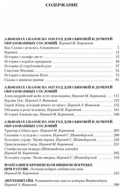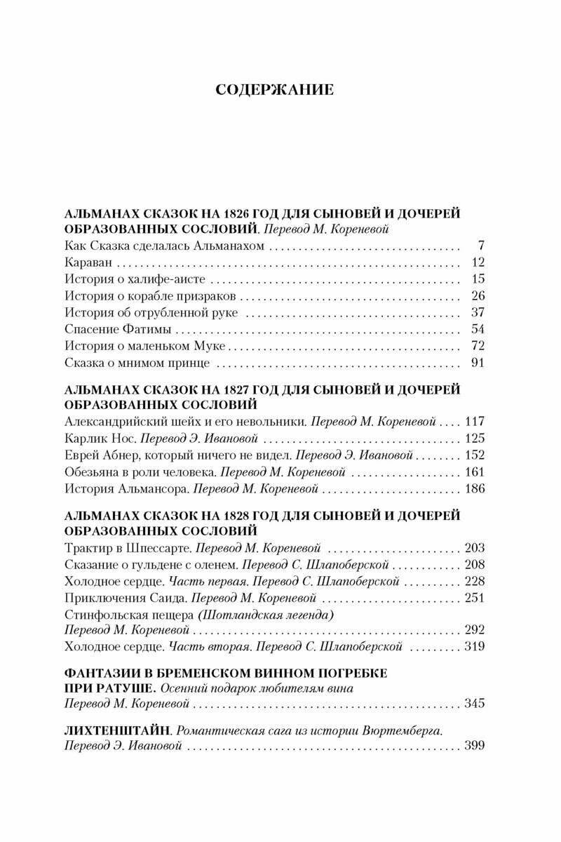 В сборнике представлены произведения выдающегося немецкого писателя-романтика Вильгельма Гауфа (1802-1827), отражающие различные грани его дарования: публикуемые на русском языке в полном виде три авторских цикла волшебных сказок, среди которых - вошедшие в сокровищницу мировой литературы истории о калифе-аисте, Карлике Носе, Маленьком Муке и Петере-угольщике; новелла "Фантасмагории в Бременском винном погребке", проникнутая воспоминаниями о веселых студенческих годах, которые писатель провел в Тюбингене, и при этом полная невероятных происшествий; наконец, роман "Лихтенштайн", где на фоне бурных исторических событий - борьбы Ульриха, герцога Вюртембергского, с могущественным Швабским союзом и Баварским герцогством - разворачивается романтическая история любви дочери верного сторонника герцога Марии фон Лихтенштайн и рыцаря Георга фон Штурмфедера.