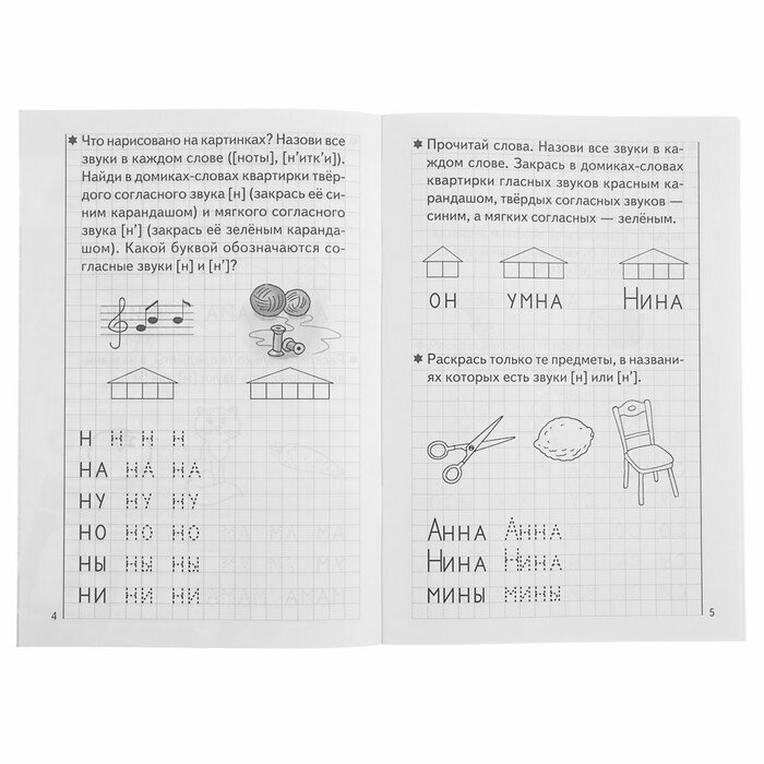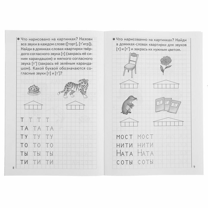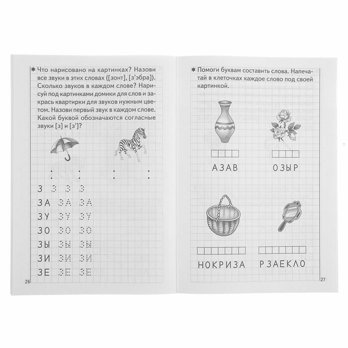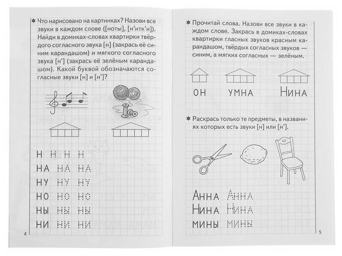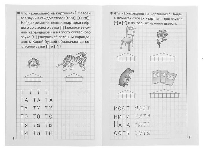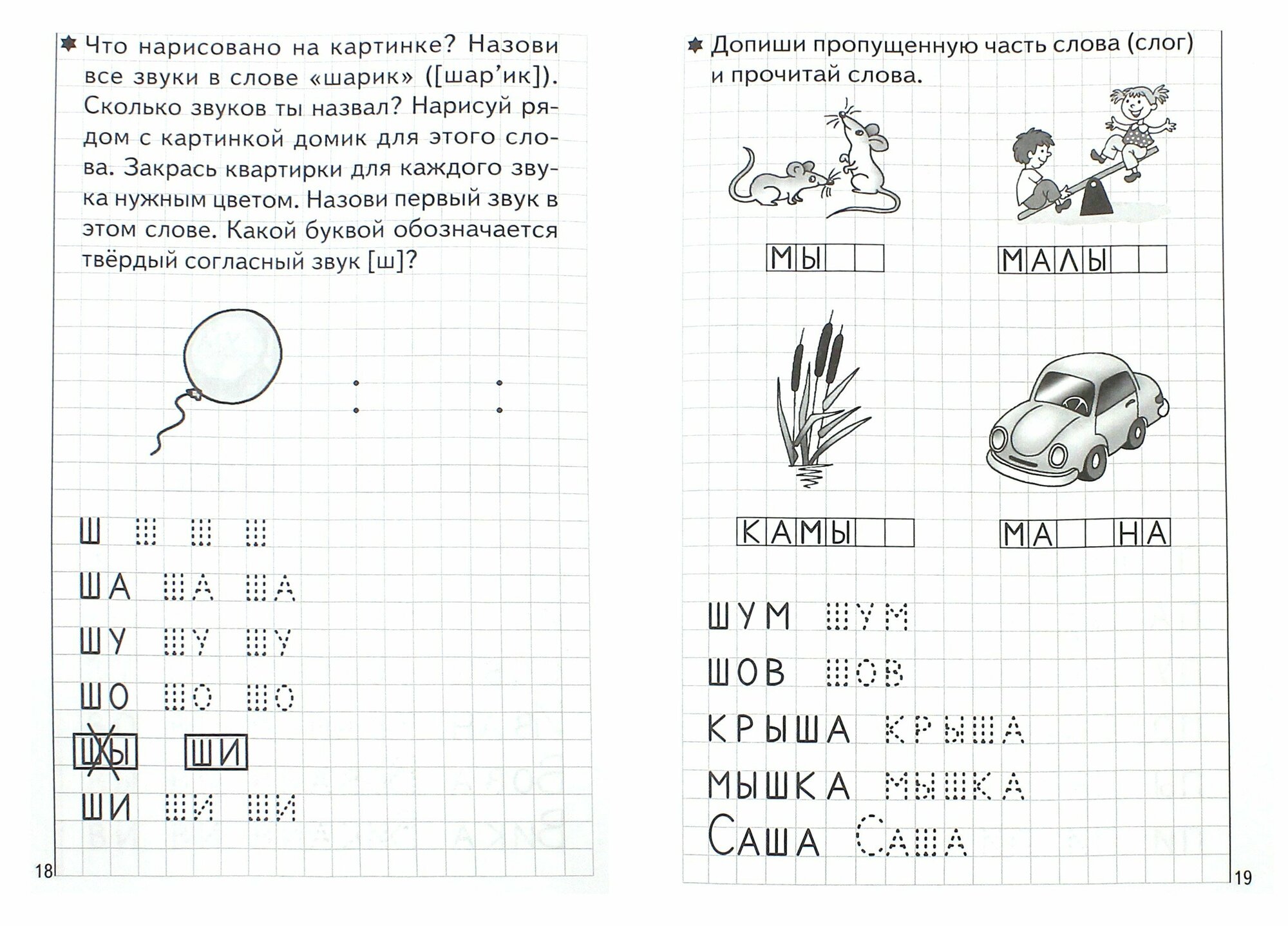 Предлагаем вашему вниманию задания по развитию навыков чтения и грамотного письма без пропусков и замены букв, которые помогут вашему ребенку успешно подготовиться к школе. Прежде чем начать заниматься, ознакомьтесь со следующими рекомендациями: - Звуки мы произносим и слышим. На письме звуки обозначаются буквами. - Буквы А, О, У, И, Ы, Э, Е, Ё, Ю, Я обозначают гласные звуки. А->[А], О->[О], У->[У], И->[И], Ы->[Ы], Э->[Э]. - После мягких согласных и твердых ([Ж], [Ш], [Ц]) буквы Е, Ё, Ю, Я обозначают один гласный звук: Е->[Э], Ё->[О], Ю->[У], Я->[А]. - В начале слова, после гласного, после Ь и Ъ знаков буквы Е, Ё, Ю, Я обозначают 2 звука: Е->[Й'Э], Ё->[Й'О], Ю->[Й'У], Я->[Й'А]. Следовательно, гласных звуков всего лишь 6: [А], [О], [У], [Ы], [И], [Э]. Е, Ё, Ю, Я - это буквы, а не звуки. - Буквы Ж, Ш, Ц обозначают только один твердый звук: [Ж], [Ш], [Ц]. - Буквы Ч, Щ, Й обозначают только один мягкий звук: [Ч'], [Щ'], [Й']. - Буквы Ь и Ъ звуков не обозначают, это знаки, которые показывают твердость или мягкость предшествующего согласного и отделяют некоторые гласные от согласных, чтобы они не сливались (Ь еще может выполнять функцию показателя мягкости согласных). - Для развития фонематического слуха (умение слышать звуки и переводить их в буквы) дети строят звуковые домики для слов, закрашивая квартирки гласных звуков красным карандашом, твердых согласных - синим, мягких согласных - зеленым. - Чтобы узнать количество звуков в слове, надо произносить по порядку все звуки и загибать пальчики на каждый звук (например, МЯЧ->[М'], [А], [Ч']). - В русском языке много слов, произношение которых расходится с написанием. В этих случаях все равно идем от слухового восприятия слова и объясняем, что писать это слово надо по-другому (например, [СТАЛЫ]->СТОЛЫ, [НОШ]->НОЖ). Желаем успеха Вашему ребенку!
