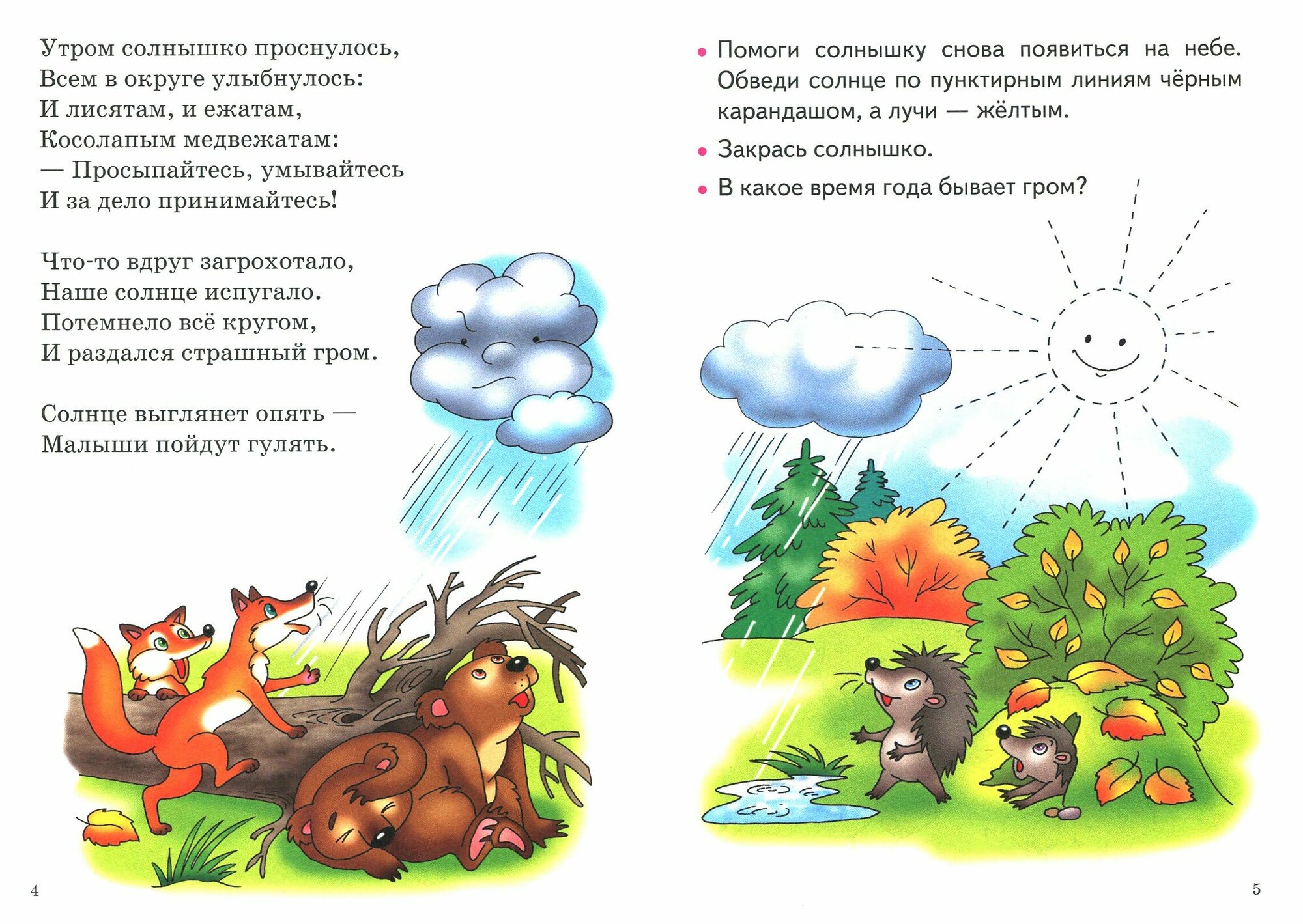 Хорошая развивающая книжечка с плотными листами и красочными иллюстрациями. На каждой странице есть задание по теме рисунка с вопросами и сопровождающими стихотворениями. И ещё достаточно много страниц, 48 страниц, много заданий.