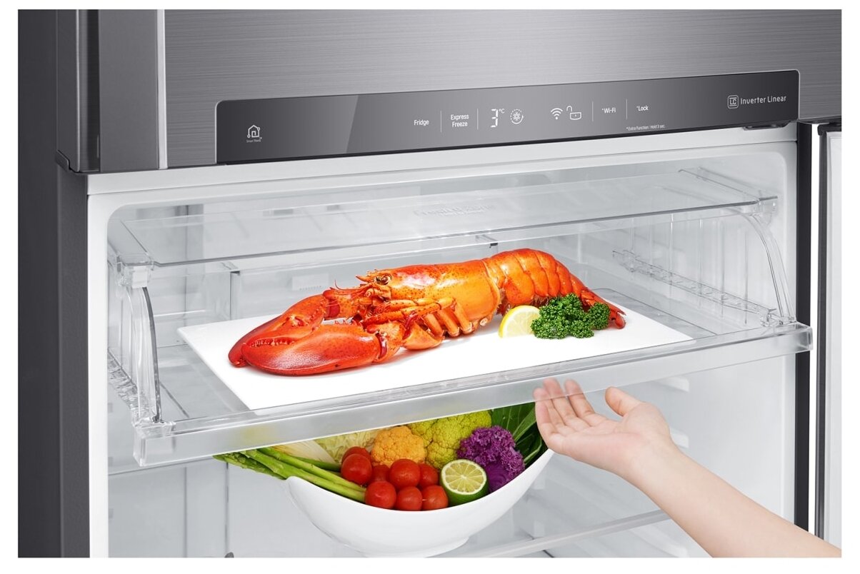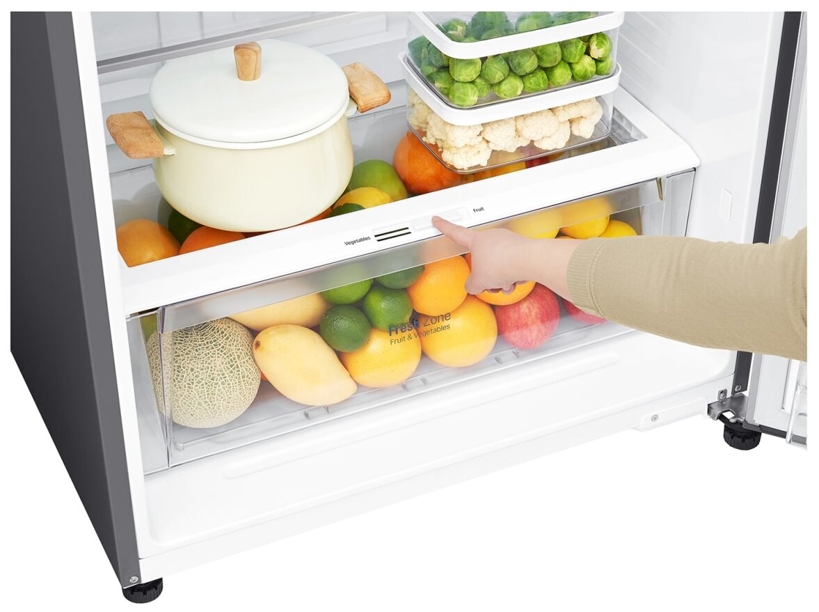 LG – широкий холодильник с верхним расположением морозильной камеры. В нём установлены два инверторных компрессора: они не только эффективно поддерживают заданную температуру, но и работают с чрезвычайно низким уровнем шума, экономно расходуя при этом электричество. Эта модель размораживается в автоматическом режиме, поэтому вам не нужно беспокоиться о наледи на внутренних стенках. зона Fresh 0 Zone Специальное отделение предназначено для хранения свежего мяса, рыбы и морепродуктов.