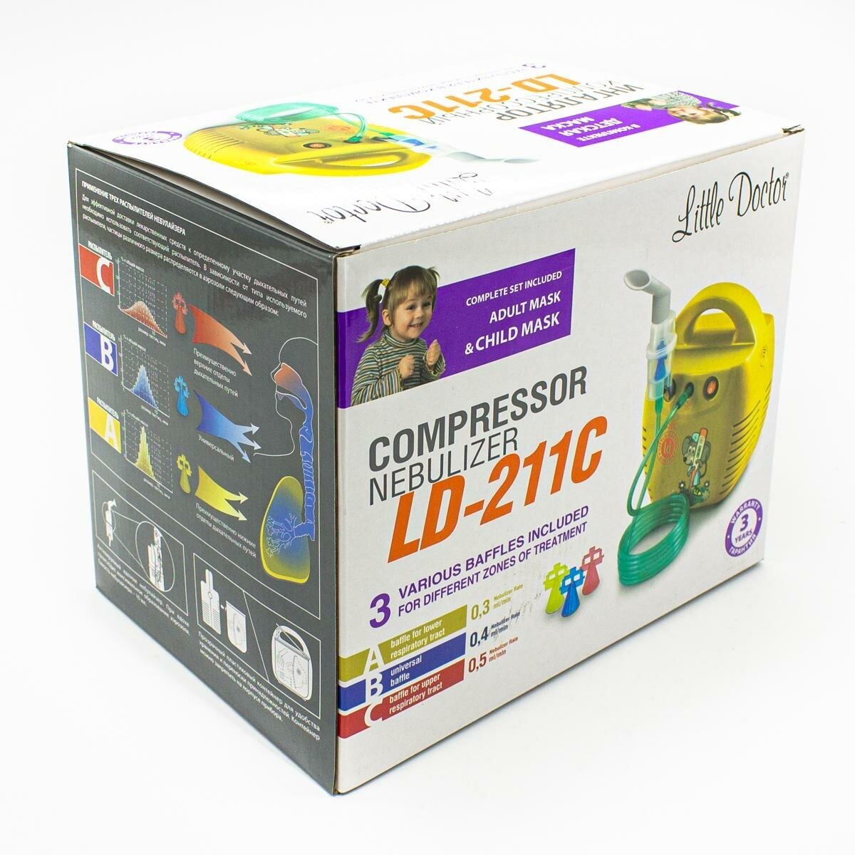 Компрессорный ингалятор Little Doctor - это современный компактный медицинский прибор, предназначенный для лечения и профилактики заболеваний дыхательных путей и легких, путем вдыхания лекарственных препаратов. Прибор может быть использован всеми членами семьи, включая детей, независимо от их возраста. Во время ингаляции можно целенаправленно воздействовать лечение на определённые участки дыхательных путей (нижние, средние и верхние отделы) при помощи сменных распылителей разного цвета:Если стоит распылитель A (желтого цвета), то размер частиц составляет 5,0 мкм и предназначен преимущественно для нижних отделов дыхательной системы.Если стоит распылитель B - универсальный (синего цвета), то размер частиц составляет 4,0 мкм и предназначен для всех отделов дыхательной системы.Если стоит распылитель C (красного цвета), то размер частиц составляет 3,5 мкм и предназначен преимущественно для верхних отделов дыхательной системы.