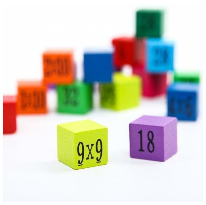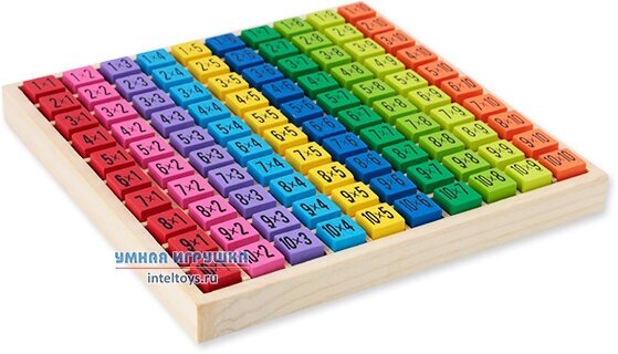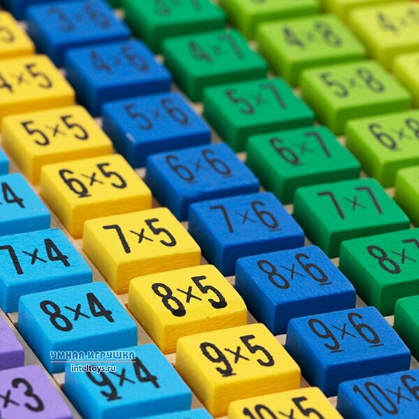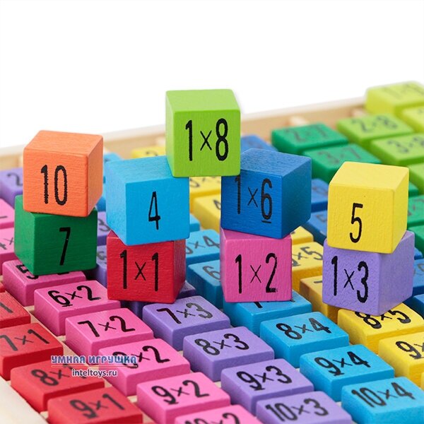 Благодаря этой красочной и яркой игрушке ребёнок очень быстро выучит таблицу умножения! Набор состоит из игрового поля и 100 разноцветных деталей. С одной стороны каждого кубика приведен пример, а с другой - ответ на него.