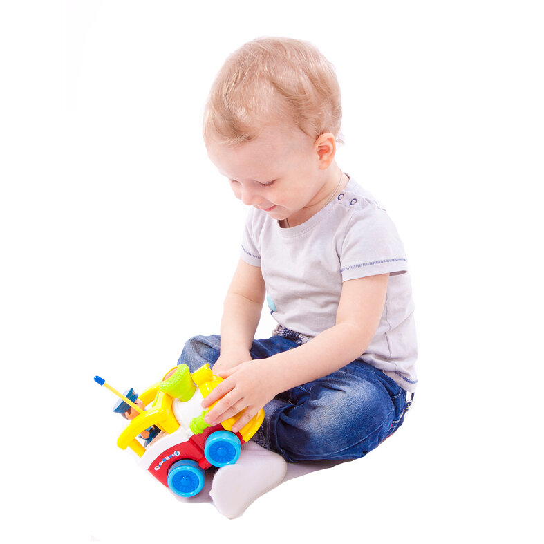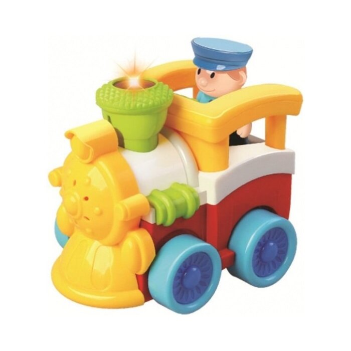 Малыш очень быстро научится управлять этим милым паровозиком самостоятельно, ведь на пульте управления игрушки всего две кнопки! Зато как быстро он умеет ездить! Чтобы путешествие паровозика было еще интереснее, малыш может нажать на фигурку машиниста или на трубу – заиграет весёлая музыка, и кроха услышит забавные звуки. Увлекательная игра будет сопровождаться световыми эффектами, и, конечно же, яркими эмоциями ребёнка! Паровозик умеет ездить вперёд и разворачиваться назад. Пульт управления сделан в форме руля, который выглядит очень реалистично.