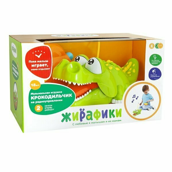 Малыш очень быстро научится управлять этим очаровательным крокодильчиком самостоятельно, ведь на пульте управления игрушки всего две кнопки! Крокодильчик умеет очень шустро бегать вперёд, разворачиваться назад, а ещё смешно шевелить хвостиком. На спине у крокодильчика – кнопки с изображением разных животных. Нажимая на эти кнопки, малыш услышит забавные голоса этих животных. А если кроха нажмет на рот крокодильчика, заиграет весёлая музыка. Увлекательное путешествие крокодильчика будет сопровождаться ещё и звуковыми эффектами, и, конечно же, яркими эмоциями ребёнка!