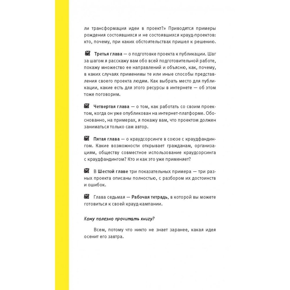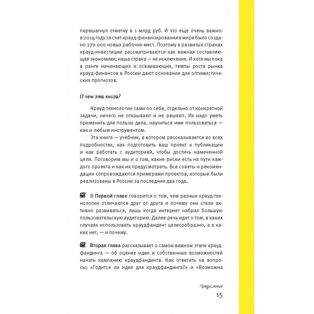 Пожалуй это одно из лучших изданий посвященных краунд-технологии. Несомненное преимущество этой книги в том, что она написана отечественным автором и описывает все реалии российского краундфандинга. Очень подробно написан раздел по созданию краунд-проектов. Также дается подробный разбор уже готовых проектов.