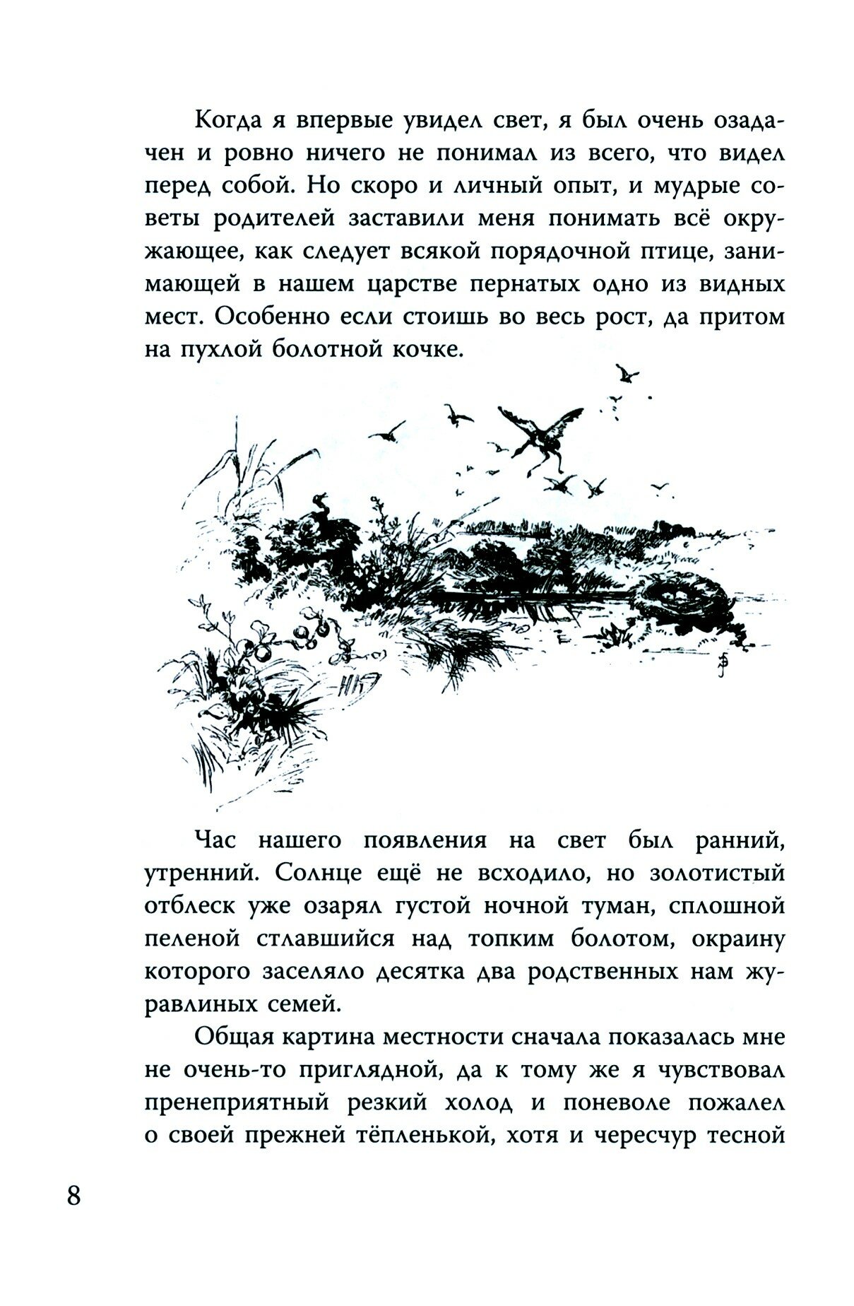 История длинного путешествия, которое проделала стая журавлей от Тверской области до озера Виктория в Восточной Африке, описана очень подробно и интересно, о всех событиях мы узнаем из рассказа старого журавля, но создается впечатление, что беседует с нами мудрый, добрый пожилой человек, очень много повидавший на своем веку. Книга одновременно не только познавательная, но и поучительная, ведь наряду с описаниями природы, мы узнаем и о различных приключениях, иногда очень опасных, которые происходят с птицами во время остановок на отдых. Особое место занимают размышления-заповеди старого журавля, которые очень актуальны и сегодня - "Живите мирно, не желая никому зла, а если вам кто сделает зло, не мстите. Помните, что всякая месть бессильна и не приносит утешения." Книга увеличенного формата, много авторских черно-белых иллюстраций, бумага офсетная.