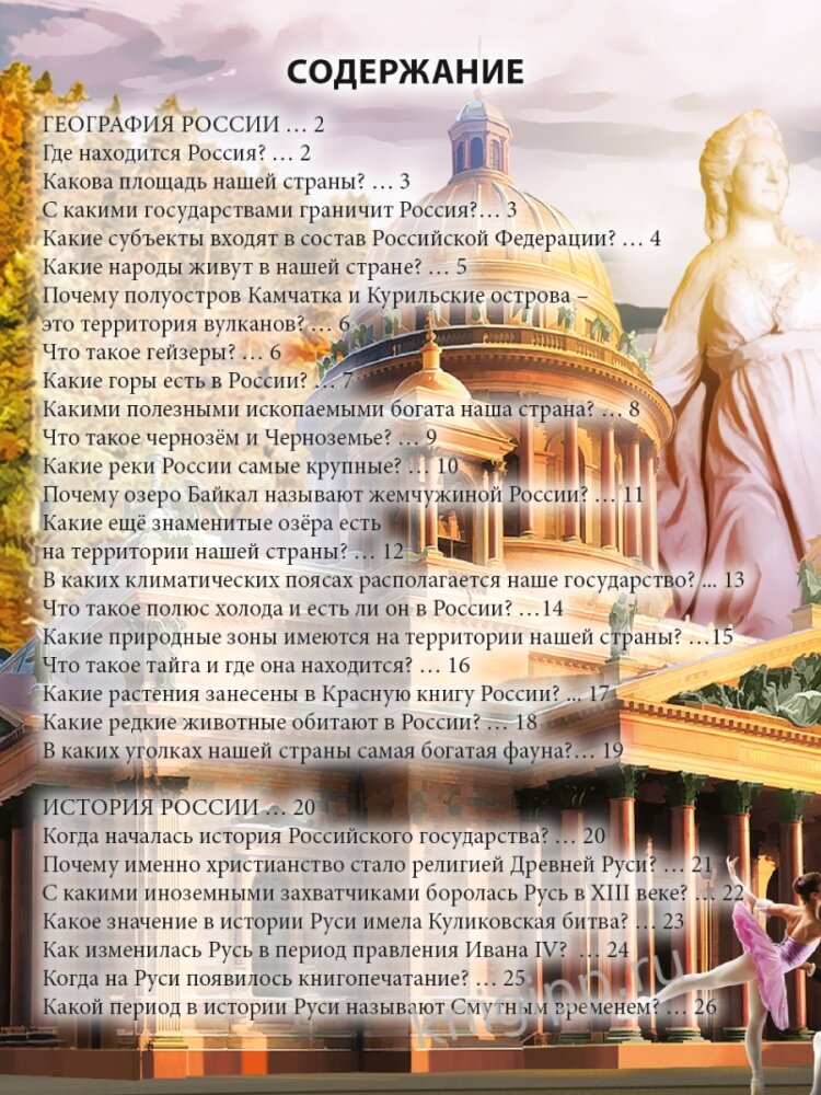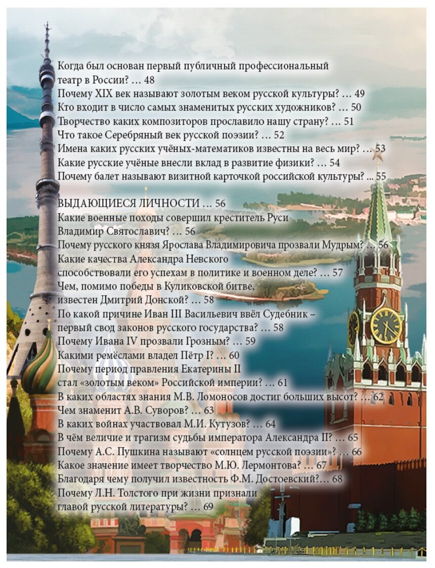 Хотите узнать больше о стране, в которой мы живем? Это издание поможет вам найти ответы на вопросы, касающиеся географии, истории и культуры России, а также познакомит вас со знаменитыми соотечественниками и уникальными достопримечательностями.