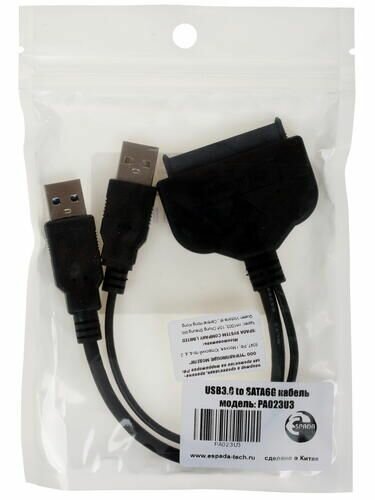 Кабель переходник для подключения устройств с интерфейсом SATA к материнской плате со входом USB 3.0, а также кабель дополнительного питания. Обратная совместимость с предыдущими версиями портов USB (1.0, 1.1 и 2.0) и жестких дисков SATA (1.5 ГБ/сек.