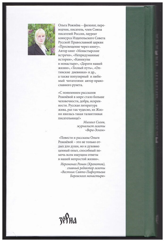 Новая книга православной писательницы Ольги Рожнёвой содержит рассказы о самых разных людях, о русских мужчинах и русских женщинах, скромных и неприхотливых, жертвенных и преданных, волевых и умелых. Эта книга о промыслительных встречах, тяжелейших испытаниях и нечаянной радости, о выборе между жизнью с Богом и без Него. Ненавязчивый, тихий голос автора призывает задуматься о смысле Бытия, услышать призыв Господа, попытаться исправить свой жизненный "черновик" и достойно проживать жизнь набело. Допущено к распространению Издательским советом Русской Православной Церкви.