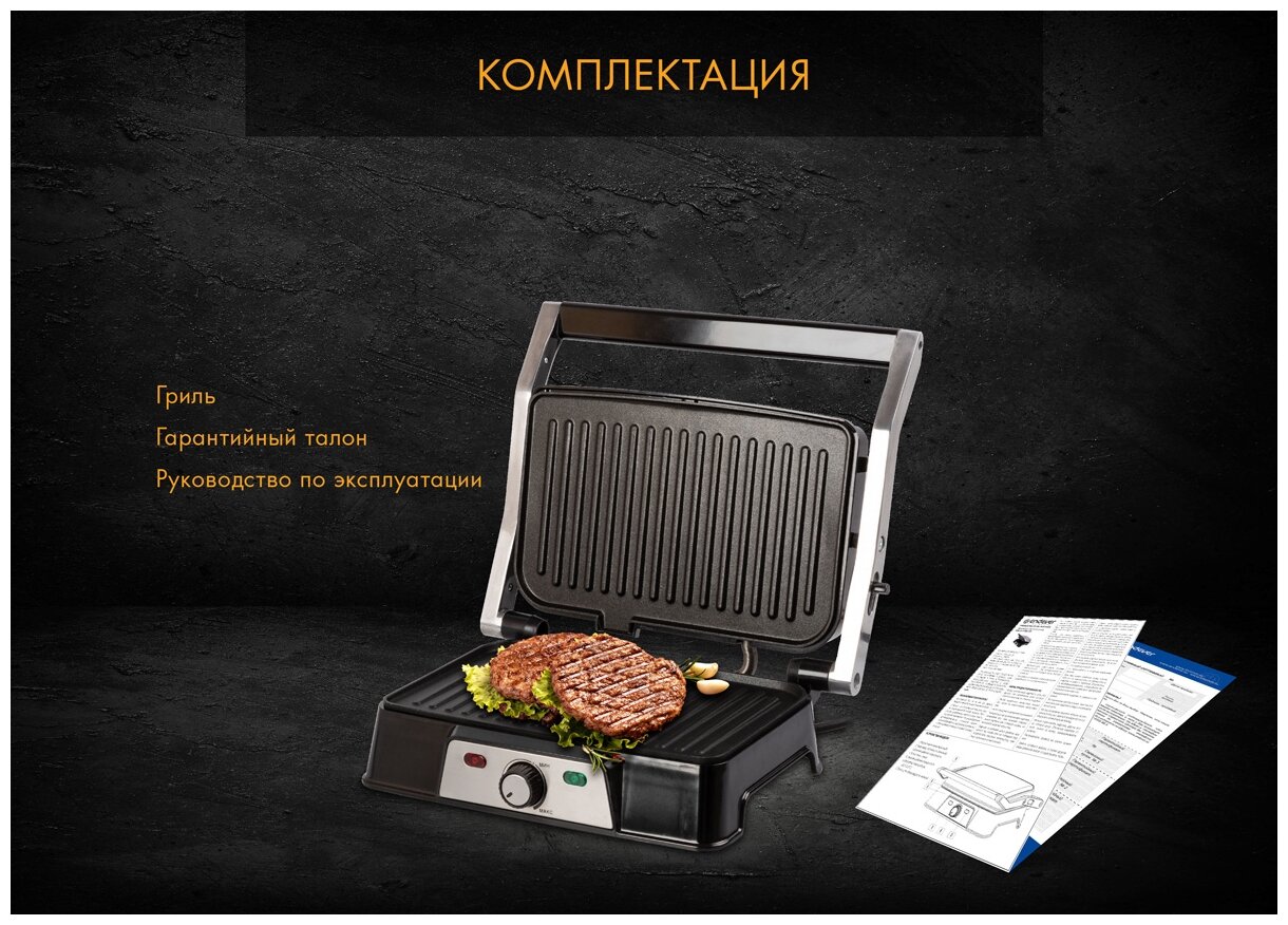 Электрический пресс-гриль подойдет для приготовления сочного и подрумяненного мяса, рыбы, овощей и тостов. Предусмотрена возможность использования прибора в открытом виде. Автоматическая регулировка высоты для тостов и стейков. Регулировка температуры нагрева. Антипригарное покрытие поверхностей. Мощность 2100 Вт. Цвет черный/металлик.