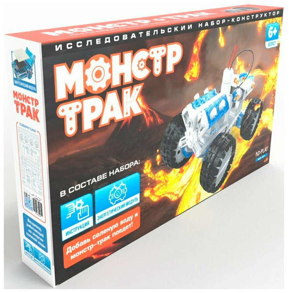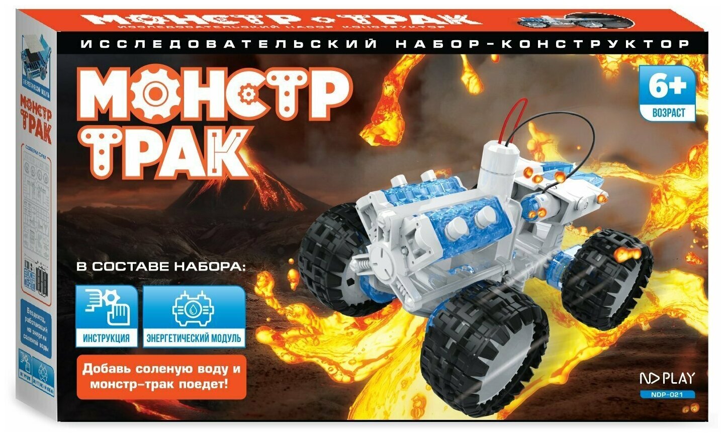 Nd Play Набор Собери сам Монстр-трак на соленой воде В наборе модель для сборки монстр трак с инструкцией. Для запуска необходимо использовать солёную воду. Монстр трак движется под действием электрохимической реакции взаимодействия соляного раствора и листов магния (3 листа в комплекте; один лист предназначен для непрерывного использования в течение 5-7 часов работы).