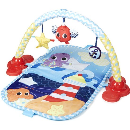 Лежа на спинке или сидя, ребенок тянет руки к игрушкам – звездочке, крабику, якорю, пытается их схватить. Крабик издает веселые звуки, привлекающие внимание малыша. Лежа на животике, ребенок с интересом рассматривает яркие рисунки на коврике: берег с маяком, море, рака и осьминожка.