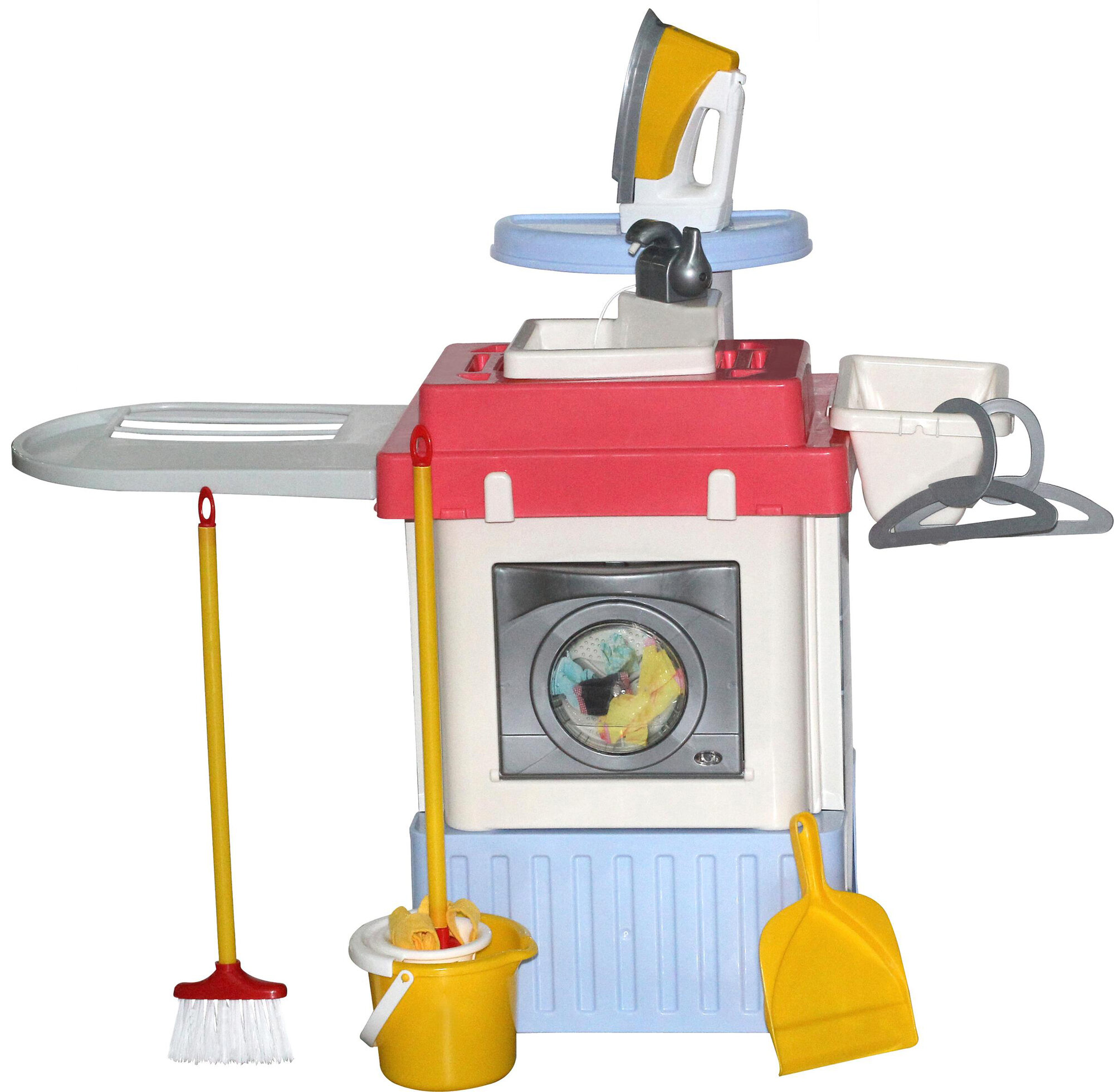 Этот набор со стиральной машинкой включает в себя все для интересных сюжетных игр. Стиральная машина выполнена из качественного материала, которые не имеет вредного запаха и не выделяет токсические вещества. Конструкция обладает округлыми формами, отсутствуют острые углы. На столешнице есть место для утюга, съемная корзина для вещей, сушилка, полочка.
