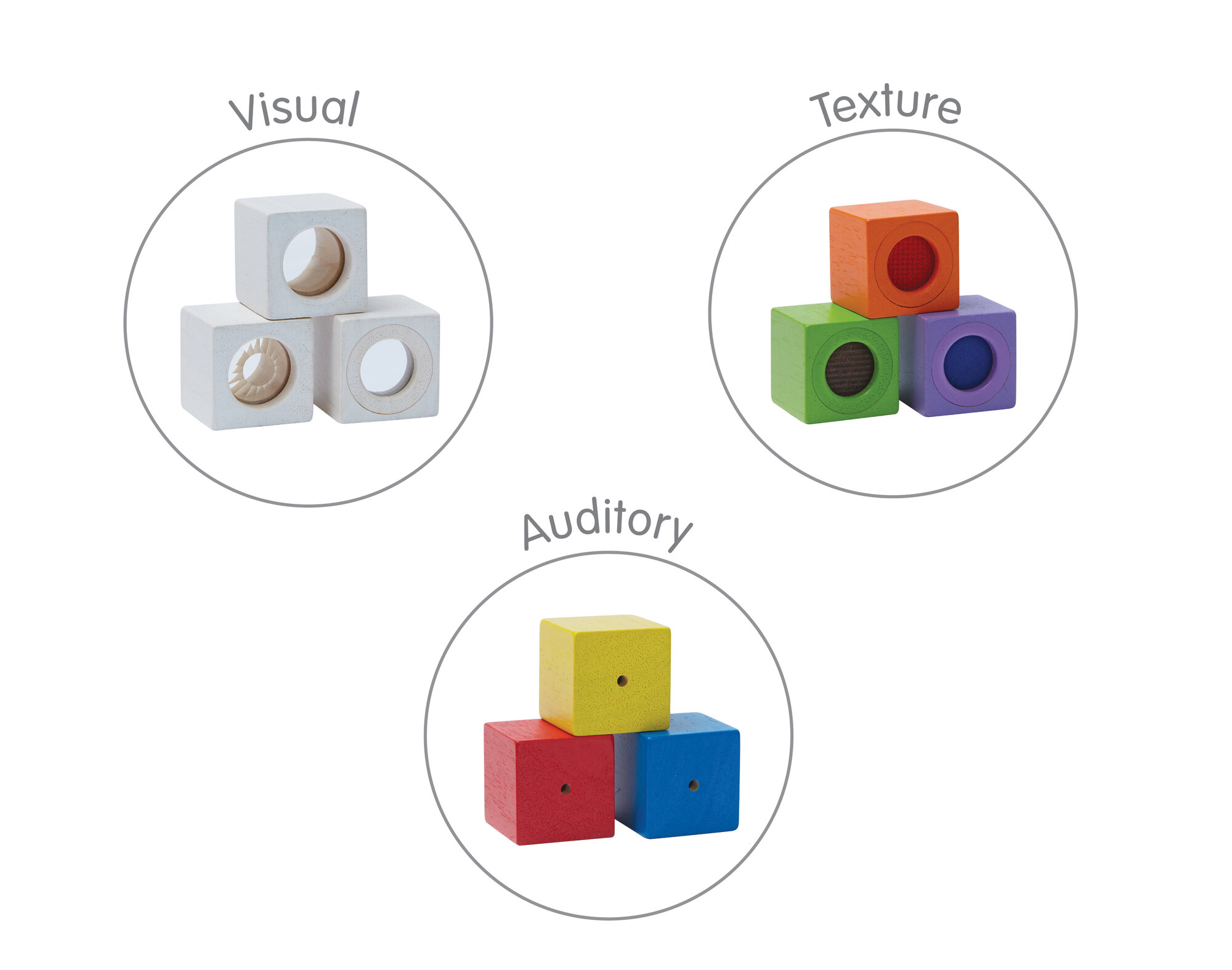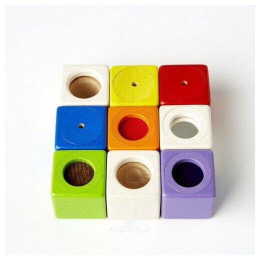 Набор из 9 блоков с различной текстурой. Звук и цвета помогают улучшить зрение, осязание и слух. Набор состоит из 3 визуальных блоков, 3 слуховых и 3 кинестетичеких блоков. Комплект поставляется в хлопчатобумажном мешке. Дети 1-2 лет могут доставать блоки из мешка, складывать их, а потом возвращать обратно в мешок. Эти действия помогают развивать мелкую моторику и координацию глаза-рука. С этим набором можо сочетать любой другой набор блоков, чтобы добавить еще больше пространства для воображения.