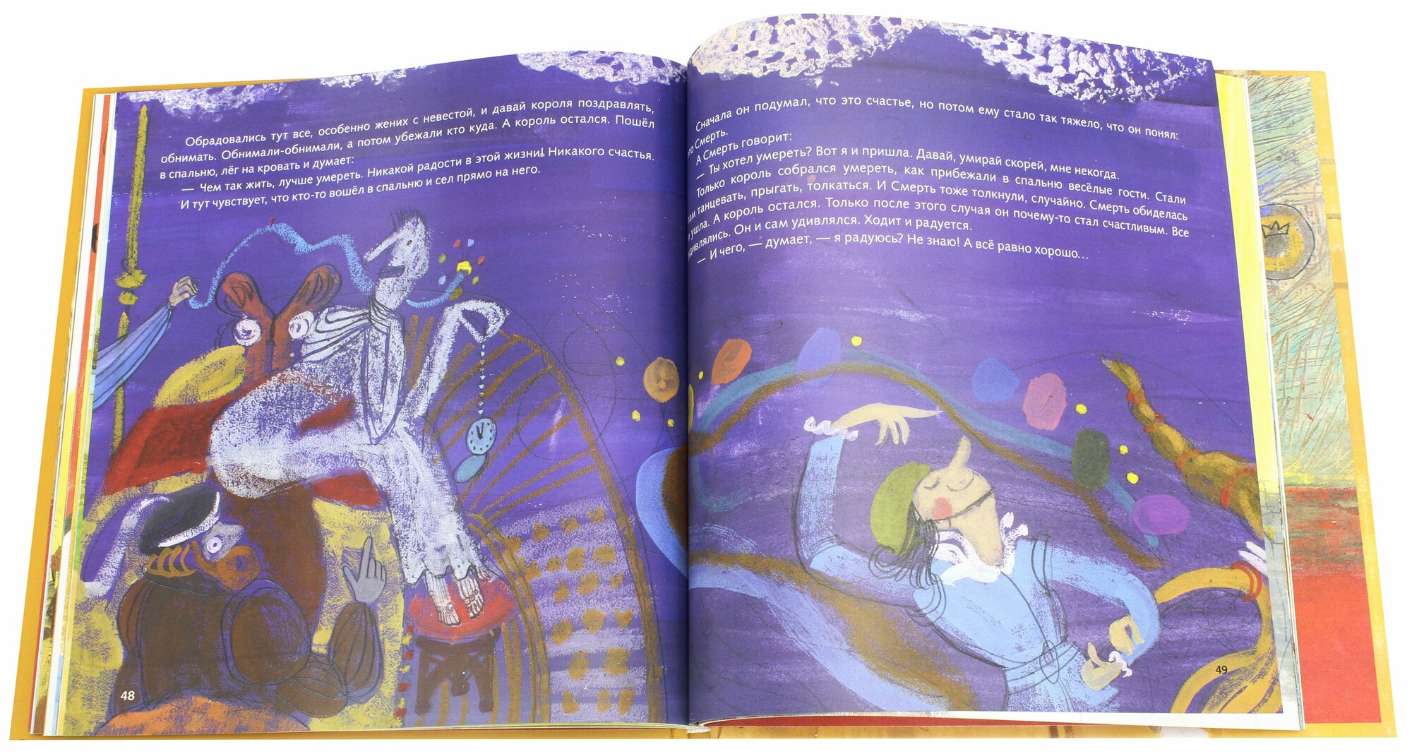 И сказки смешные, и картинки смешные… Книга «сделана», ни мельчайшей детали не упущено, очень атмосферное издание, с настроением. Моим детям понравилось, главное — необыкновенно красиво нарисовано, и как во сне, что ли, остается чувство легкой недоговоренности, картинки хочется разглядывать внимательно, долго, они заставляют подумать, повоображать, посочинять. У автора замечательный язык — вроде очень все просто, кратко, а до чего складно и талантливо! Любимой сказкой стала «Король танцует», очень современно — когда не знаешь, как решить проблему, измени свое отношение. Сохраняй спокойствие, делай мир вокруг прекраснее — и все устроится, вот увидите!