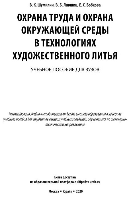 Охрана труда и охрана окружающей среды в технологиях художественного литья. Учебноеи пособие (Шумилин Владимир Константинович; Лившиц Виктор Борисович; Бобкова Елена Сергеевна); Юрайт, 2019
