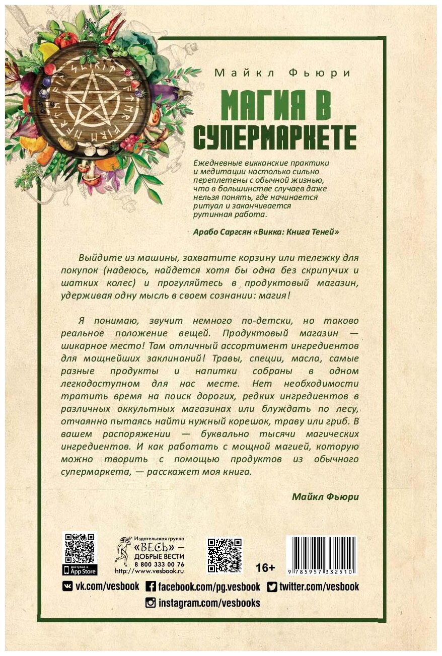 Если вы всегда хотели приблизиться к миру магии, но вас останавливали рецепты в духе «возьмите лапку дракона», то эта книга - для вас. В ней Майкл Фьюри открывает ранее неприметную нашему глазу, но доступную и демократичную сферу, где вы можете найти ингредиенты для своих магических экспериментов, - супермаркеты! Книгу можно читать по порядку или обращаться к отдельным главам по ситуации. Например, если вам хочется сделать особенный ужин ко Дню зимнего солнцестояния - обратитесь к главе, посвященной саббатам. Если вы нуждаетесь в успокоении, снятии напряжения и устранении стресса — прочитайте рекомендации по очищению и гармонизации и осваивайте приготовление травяных настоек и зелий. Либо вы сможете сделать специальный парфюм для любовной магии, волшебный макияж и даже особый суп для влюбленных, если в отношениях что-то пошло не так. А глава, посвященная развитию ведьмовских способностей, позволит пробудить в себе таинственные силы и научиться использовать их потенциал. Эта книга - полезный компендиум на любой сезон и отличное подспорье на каждый праздник Колеса Года.