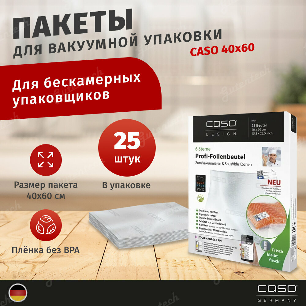 Чтобы продукты как можно дольше сохраняли свои питательные свойства, аромат, вкус и были пригодными для употребления в пищу, рекомендуется хранить их в вакуумных упаковках. Вакуумные пакеты Caso подходят для всех вакууматоров с шириной сварочной планки 40 см, производятся из качественных пищевых полимеров, в составе которых не содержатся вредные элементы. Пленка отличается высокой прочностью и стойкостью к разрыву (толщина 160 мкм). Пленка является термостойкой, подходит для заморозки, СВЧ печей, а также приготовления продуктов в су виде. Возможно многоразовое использование и мойка в посудомоечной машине. Благодаря армированному слою пакета обеспечивается максимальная откачка воздуха, что позволяет создать необходимый уровень вакуума. В комплекте 25 пакетов размером 40х60 см, а также стикеры с QR-кодом. При помощи приложения «Caso Food Manager» Вы всегда сможете контролировать количество продуктов в холодильнике, а также сроки их хранения.