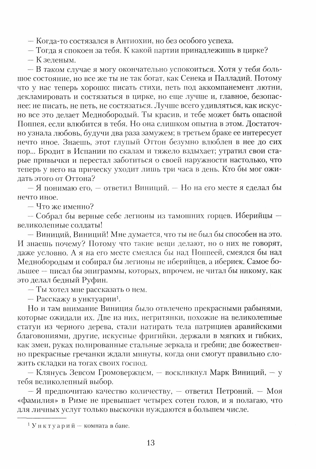 Знаменитый исторический роман Генрика Сенкевича повествует о событиях великих и почти мифических. Первый век нашей эры, императорский Рим времен полубезумного лицедея Нерона, одержимого манией величия. Пылающий Вечный город, звери, рвущие на арене цирка тела рабов, невообразимые оргии и массовые казни… На этой пропитанной кровью и слезами земле разворачивается трагическая история первых христиан, принимают мученическую смерть апостолы Петр и Павел. В ткань своего поистине эпического повествования автор вплетает сюжеты о драматической судьбе Петрония, утонченного эстета и скептика, и о пламенной любви римского патриция Марка Виниция к христианке Лигии, любви всепобеждающей, освященной истинной верой, заставляя читателя задуматься о свободе выбора, дарованной человеку.