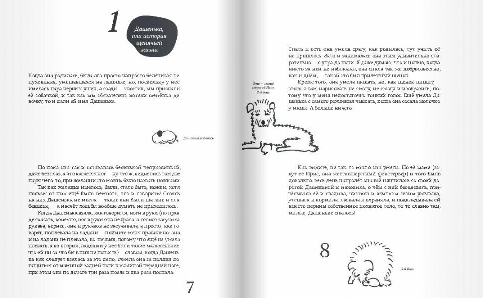 Когда она родилась, была это просто-напросто беленькая чепуховинка, умещавшаяся на ладошке, но, поскольку у неё имелась пара чёрных ушек, а сзади - хвостик, мы признали её собачкой, и так как мы обязательно хотели щенёнка-девочку, то и дали ей имя Дашенька.