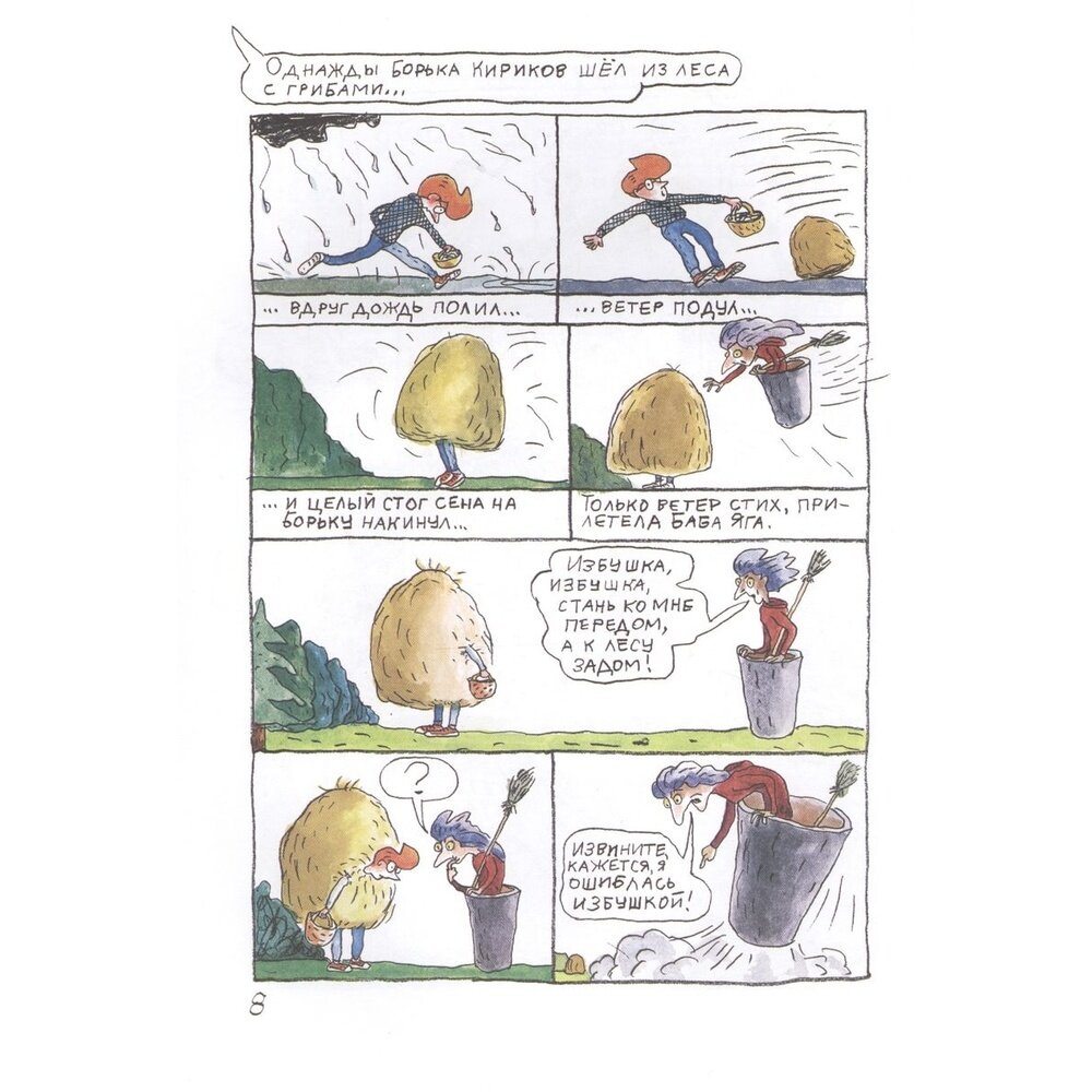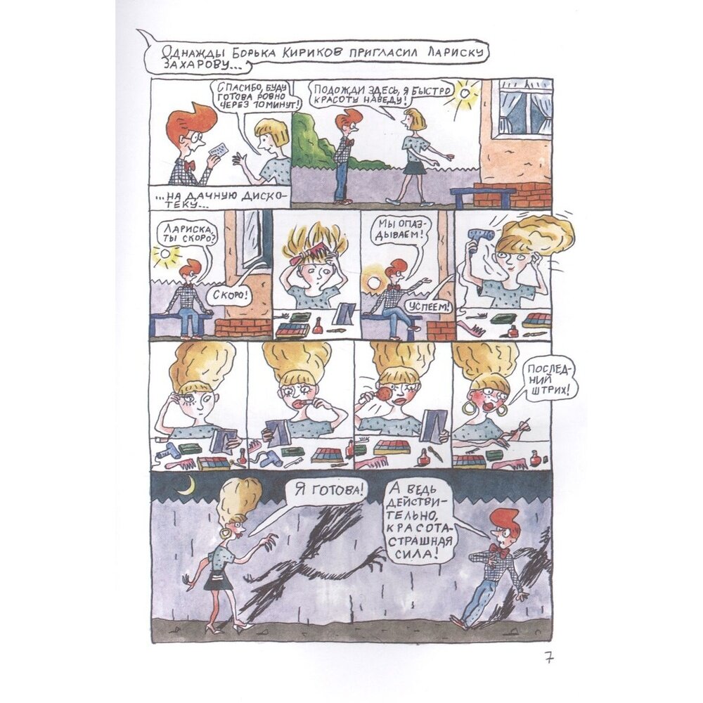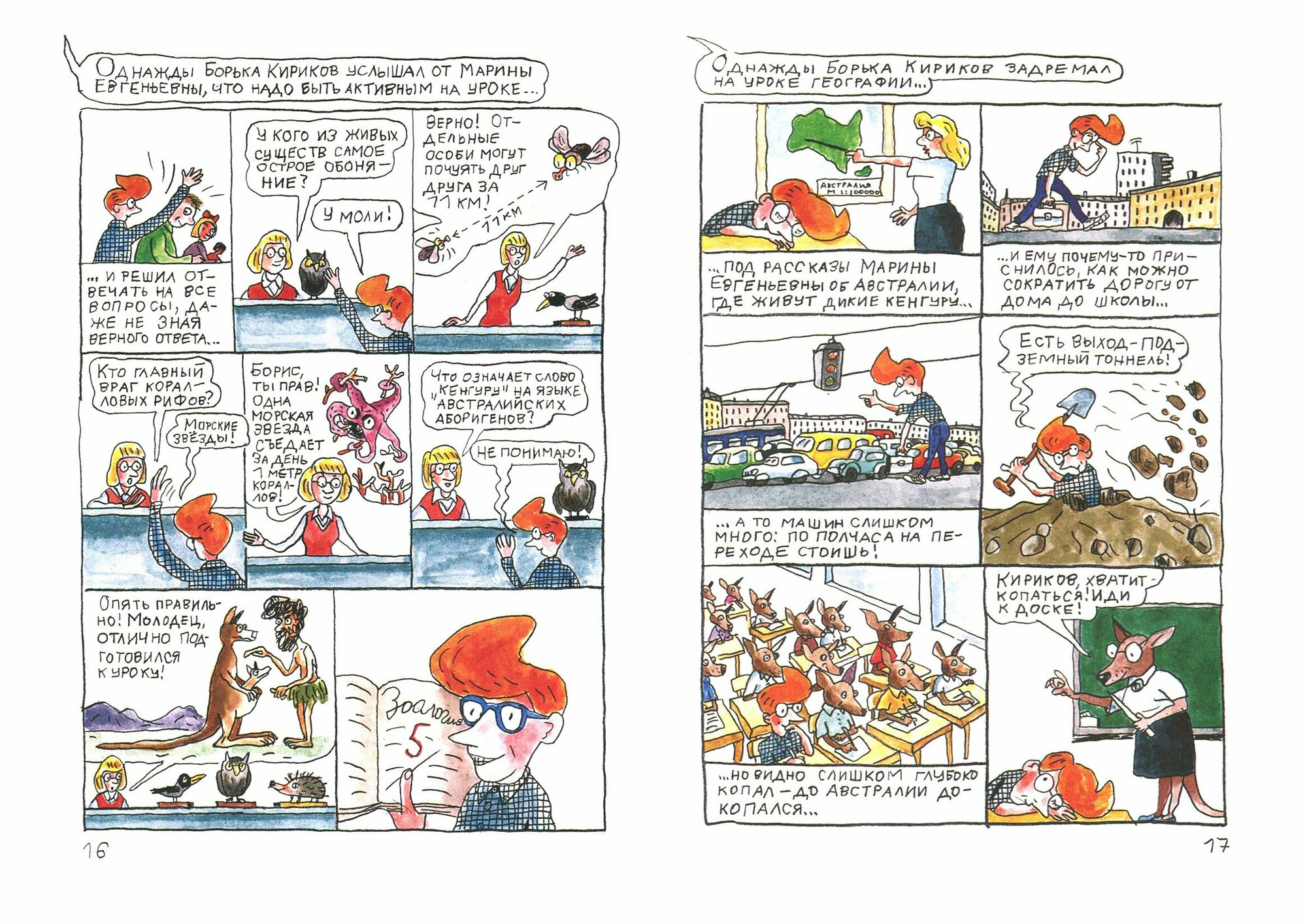 Комиксы очень понравились. По сюжету - ну, что - то вроде серий из Ералаша (некоторые сюжеты действительно оттуда - что было первым неизвестно, например - "случай в автобусе... сиди, я не старая.. постою.. да я и так уже две остановки проехал)). Одна история - один разворот. Всего 7 глав, каждый разворот начинается так "Однажды Борька Кириков..."