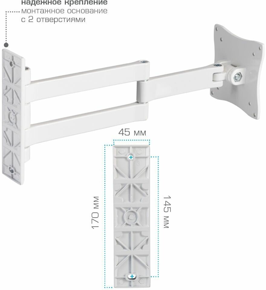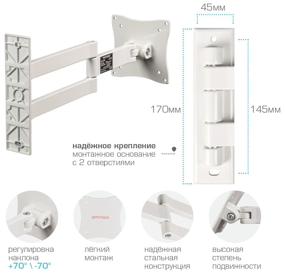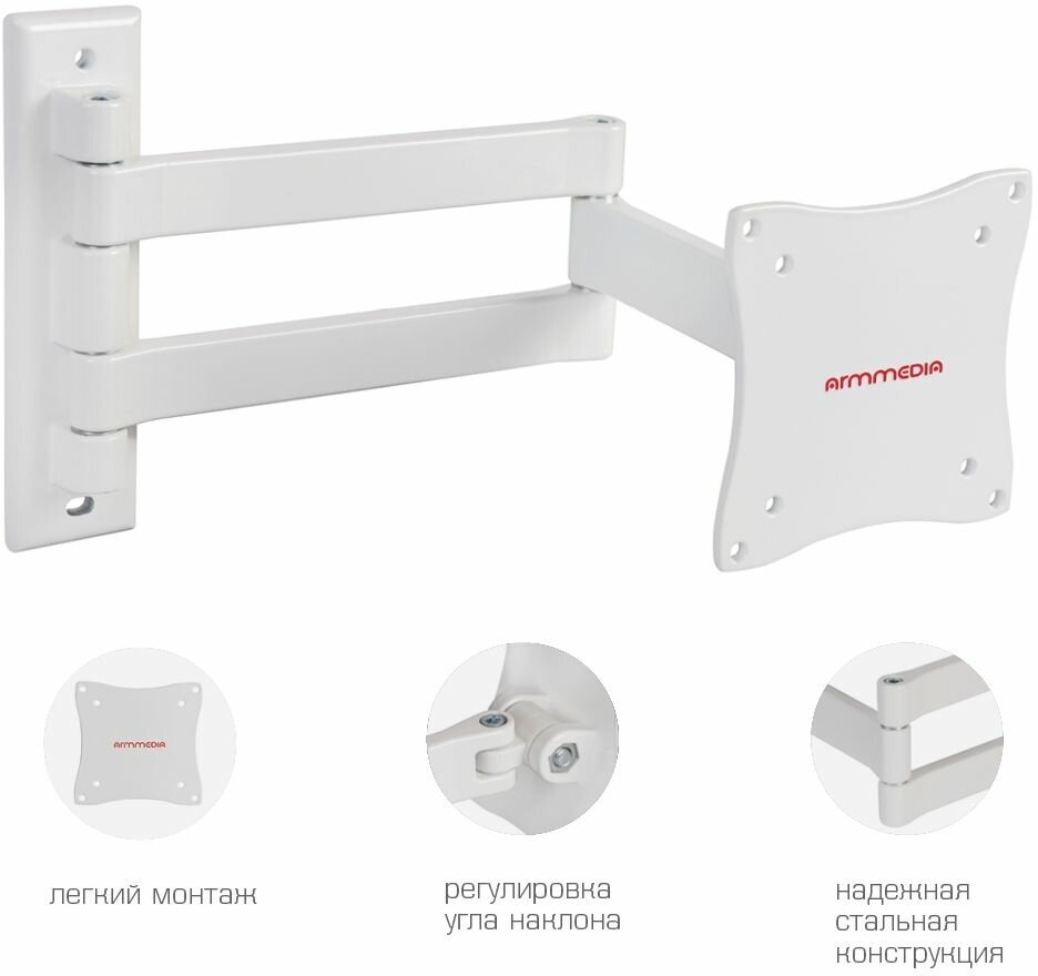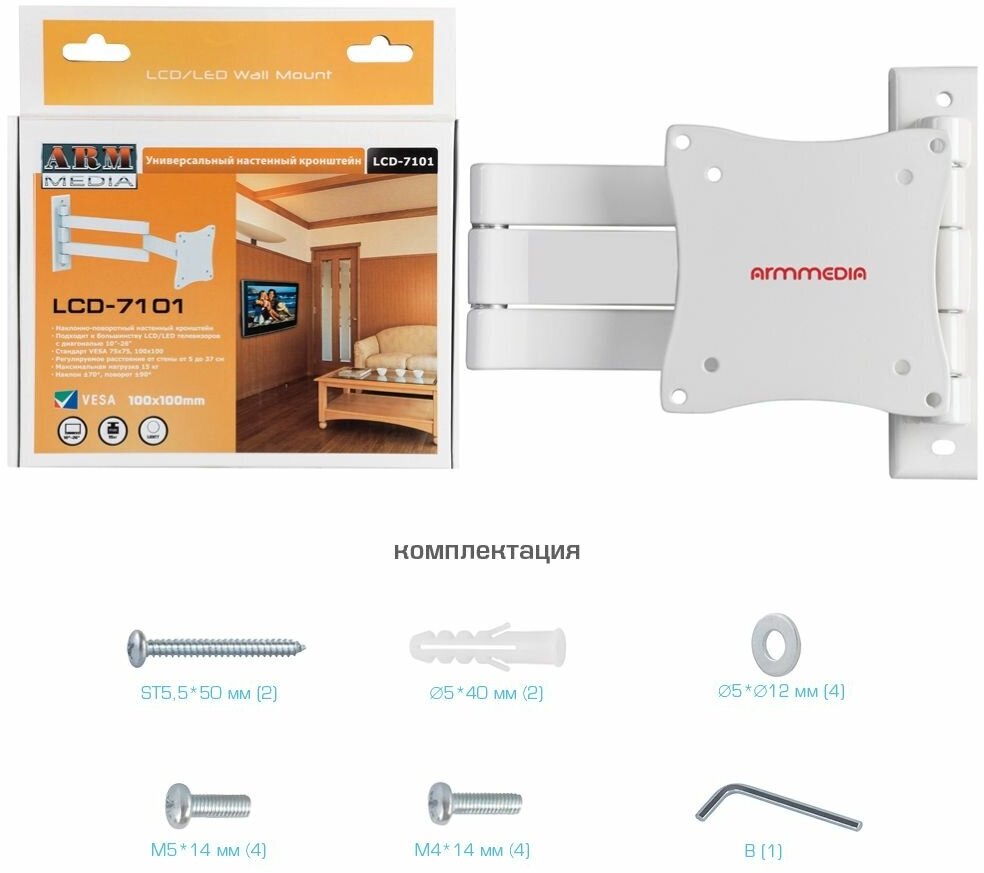 Кронштейн ARM MEDIA LCD-7101 изготовлен из стали, и отличается высокой прочностью. Максимальная нагрузка составляет 15 кг.
