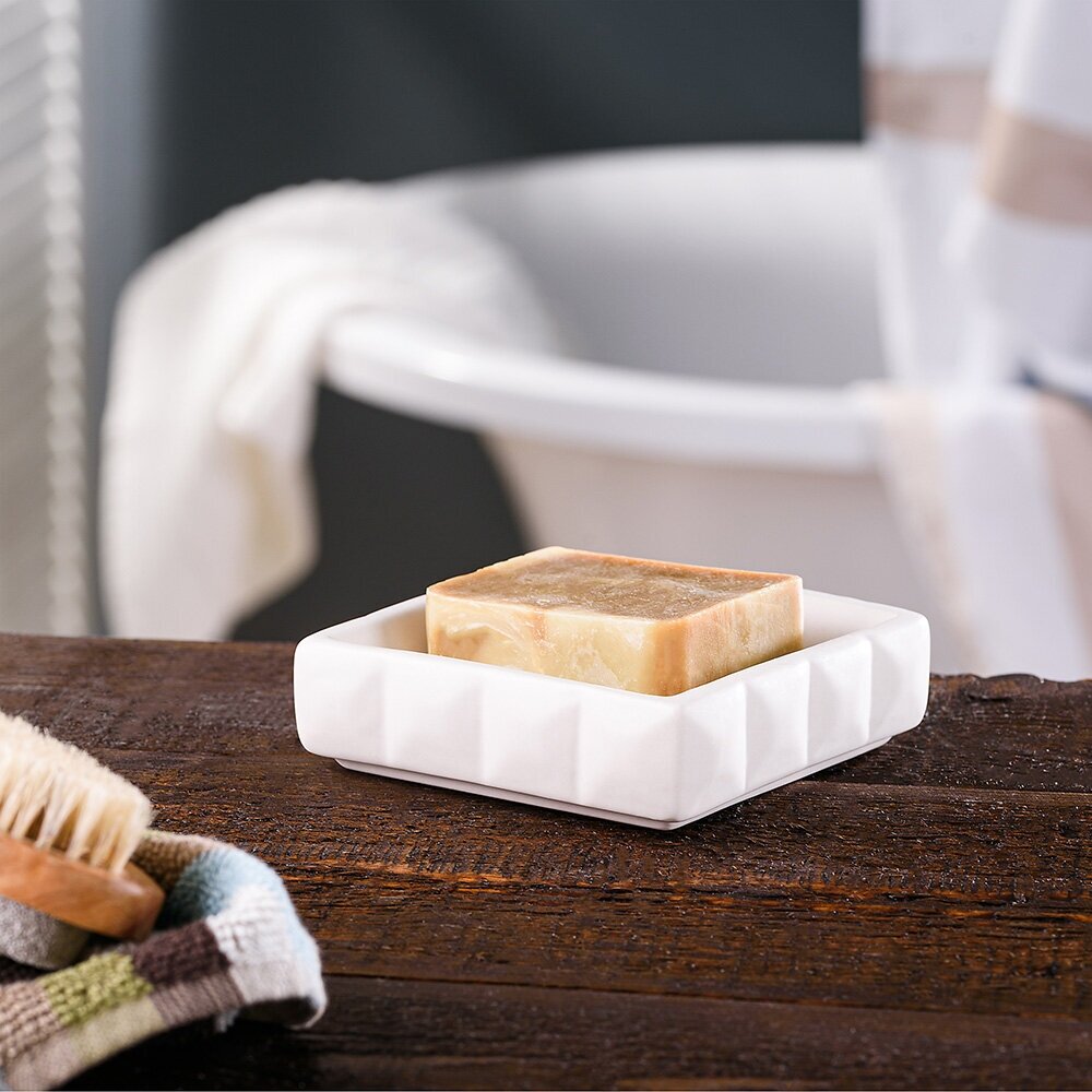 Четкие геометрические формы аксессуара подойдут для приверженцев современного минималистичного дизайна. Белоснежная поверхность мыльницы, разделенная на множество квадратов, повторяет ритм, задаваемый кафельной плиткой, и позволяет интерьеру иметь актуальное и гармоничное звучание.