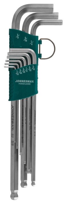Набор торцевых шестигранных ключей с шаром 1/16"-3/8" 9 шт. Jonnesway X-TRA LONG представляет собой комплект дюймовых угловых ключей с шарообразными наконечниками на более длинной стороне.