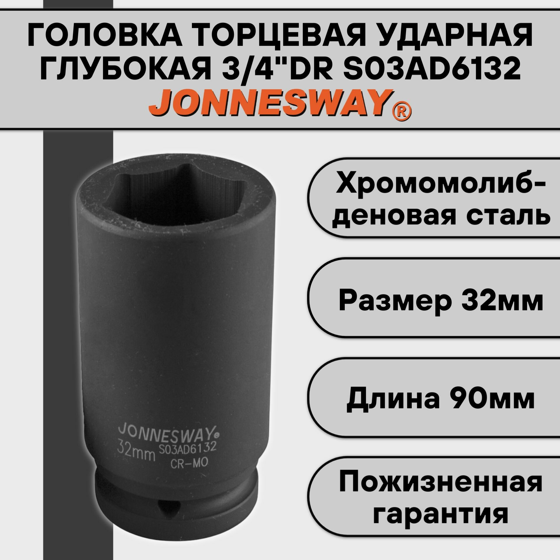 Ударная глубокая торцевая головка 3/4"DR (32 мм) Jonnesway используется для ведения слесарно-монтажных работ. Хромомолибденовая сталь обеспечивает отличную износостойкость. Фосфатное покрытие защищает от коррозии. Устойчива к значительным динамическим нагрузкам. Диаметр крепежа составляет 32 мм.ПреимуществаУстойчивость к постоянным динамическим нагрузкам, которая достигается применением специальной сталиОсновным легирующим элементом является молибден, придающий материалу свойства, обеспечивающие компромисс между твердостью и прочностью Защитное покрытие, применяемое при изготовлении – фосфатирование, придает инструментам матовый черный цвет Защита от коррозии