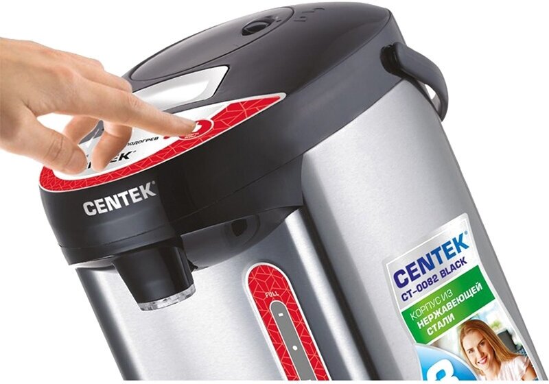 Термопот Centek CT-0082 - это многофункциональное устройство, которое объединяет в себе функции чайника и термоса. Термопот обеспечит горячей водой в любое время суток без постоянного подогрева жидкости. Конструкция достаточно тяжелая, но она и не предусматривает частое перемещение. Для того, чтобы налить воду, не надо его поднимать и переворачивать, достаточно лишь надавить на кнопку. Стильный и лаконичный дизайн прекрасно впишется в любой интерьер.