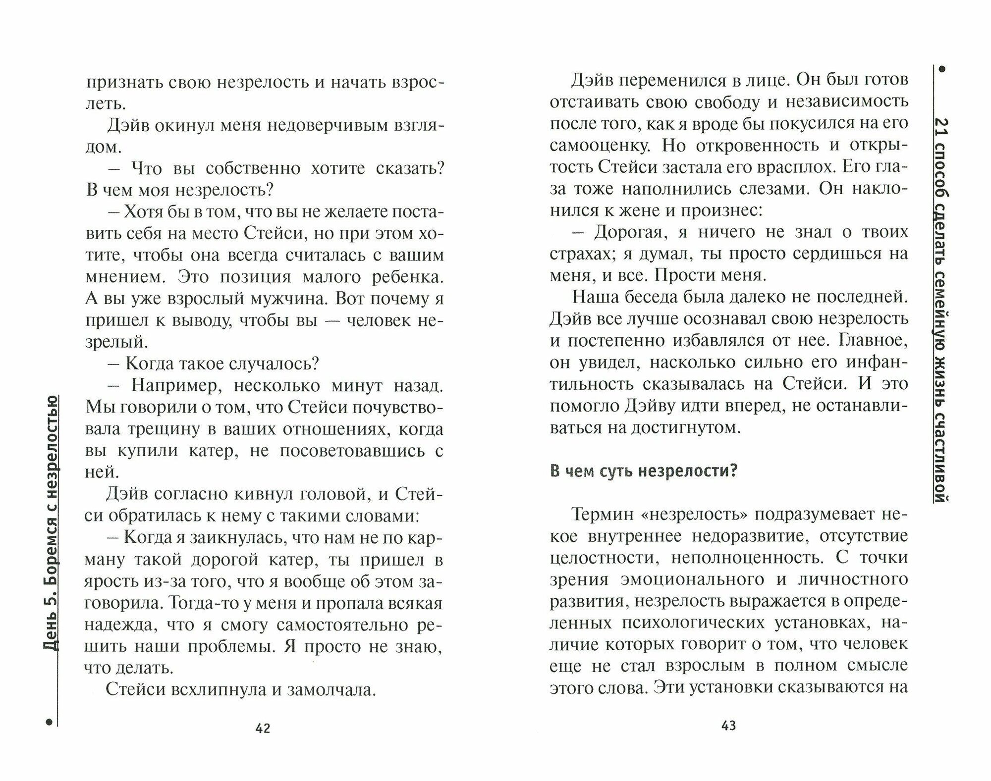 Мне книга понравилась и показалась полезной. Сейчас очень много литературы, посвящённой саморазвитию, отношениям, но "21 способ сделать семейную жизнь счастливой" подкупила меня тем, что, по сути,здесь очень много ссылок на первоисточник для каждого христианина - на Евангелие. Мне, например, часто сложно бывает истину переложить на свою обычную, повседневную жизнь. Авторы этой книги очень помогают - В 21м дне нет какой-то уж слишком большой конкретики - "делайте так-то и так-то и будет вам счастье", но даны очень верные, "общечеловеческие" рекомендации о построении отношений как внутри семьи, так и за её рамками - с окружающими. Например, мне очень понравились слова о том, как важно не пытаться изменить человека рядом с тобой, а заниматься в первую очередь своим духовным ростом. При этом авторы чётко говорят о необходимости соблюдения своих "границ" в отношениях, недопущении неуважительного или оскорбительного отношения к себе. Об умении не обижаться и и необходимости прощать. Об искренности и важности диалога в семье. О том, что обязательно нужно выражать свои мысли и эмоции, но в уважительной форме. Это лучше прочитать - хорошая форма подачи "прописных" истин жизни, очень доходчиво.Отлично мотивирует к работе над собой и своими качествами характера. Книга удобного "карманного" формата, шрифт крупный. Мне было удобно читать.