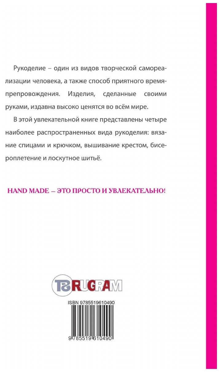 Рукоделие - один из видов творческой самореализации человека, а также способ приятного времяпрепровождения. Изделия, сделанные своими руками, издавна высоко ценятся во всём мире. В этой увлекательной книге представлены четыре наиболее распространенных вида рукоделия: вязание спицами и крючком, вышивание крестом, бисероплетение и лоскутное шитьё.