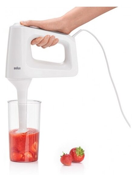 Миксер Braun HM 3105 WH комплектуется мерным стаканом, насадками для замешивания теста, парой венчиков и блендером. По сути, вы приобретаете два прибора: миксер с широким функционалом и погружной блендер. В этой модели предусмотрено 5 скоростей. В зависимости от консистенции закладываемых продуктов и от технологии приготовления вы можете использовать как минимальное, так и максимальное количество оборотов. Имеется здесь и турборежим, который используется по мере необходимости. Например, с его помощью вы легко очистите насадки или быстро смешаете молочный коктейль.
