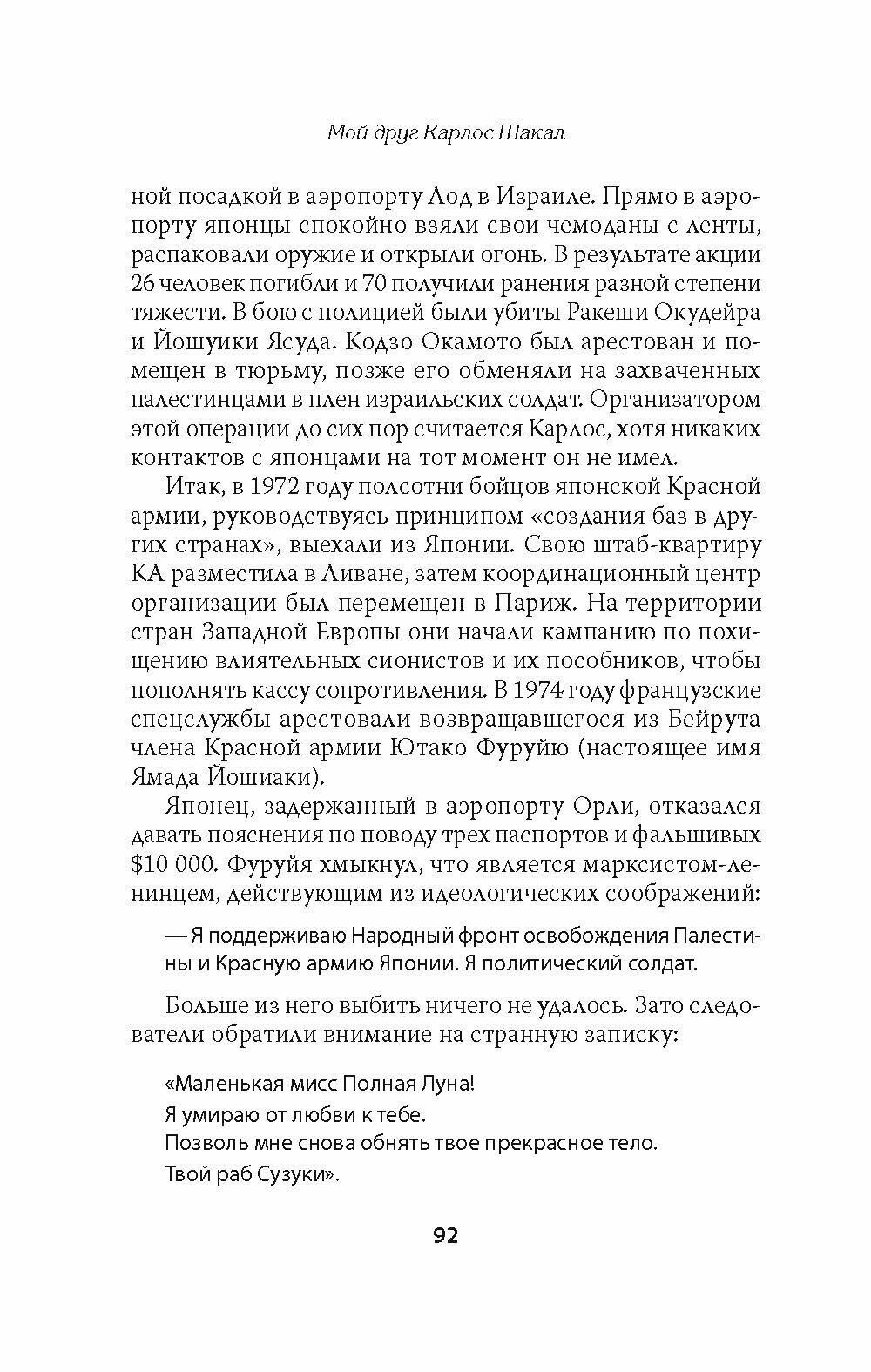 Герой этой книги стал прототипом для Голливудских блокбастеров "Шакал" и "Карлос". Его политическая борьба началась в то время, когда ветер перемен прокатился по всем странам: Хо Ши Мин во Вьетнаме, немыслимый Мао в Китае, в Гаване смолил сигарой Фидель, а где-то в джунглях Боливии готовился к гибели Че Гевара. Карлоса же видели по всему миру, а после захвата министров ОПЕК назвали "звездой терроризма". Саддам Хусейн восторгался им, он говорил о его необычайной мужестве. Каддафи, этот великий бедуин, давал ему оружие . Сегодня Саддам и Каддафи жестоко убиты, а он, может быть последний человек, который знает их тайны. Он прославился под именем "Карлос", а враги дали ему кличку "Шакал", в честь героя книги Форсайта "День Шакала", но у них было мало общего. Шакал из романа убивал за деньги, Карлос сражался за дело свободы. Его способность запутывать следы и уходить от преследования была зубной болью для спецслужб западных стран. Последним прибежищем Ильича стал Судан, где Карлос вел жизнь преподавателя, рассказывая юным чернокожим бойцам о революционном ремесле. Но недолго. Он был похищен американо-израильской разведкой и доставлен во Францию, где его ожидала тюремная камера. Так кто же он? Террорист или революционер? "Карлос должен быть освобождён", - Александр Проханов. "Карлос наше знамя!" - Герман Садулаев. "Приговор Карлосу - приговор всему человечеству", - Исраэль Шамир. "Мой привет старому революционеру!" - Эдуард Лимонов.