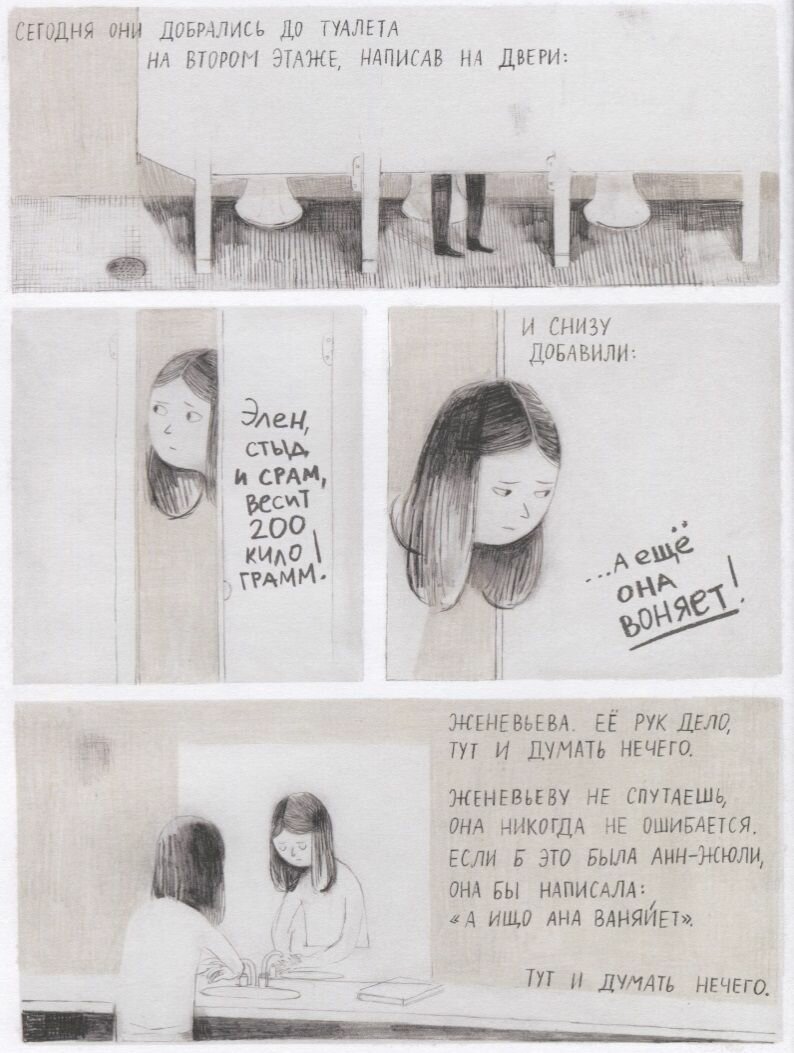 Графический роман канадского драматурга Фанни Бритт и художницы Изабель Арсено о школьном одиночестве и счастливом избавлении. Одноклассники выбрали Элен мишенью для насмешек, а она им поверила - поверила, что никому не нужна, что она толстая сарделька и что друзей у нее быть не может. Элен существует в сером тумане давней приглушенной тоски, и цвета на этих страницах появляются только тогда, когда речь заходит о романе "Джейн Эйр" - в эту книгу, как в прекрасный сад, убегает Элен, чтобы не слышать оскорблений. У нее не хватает сил противостоять школьным обидчикам или не обращать внимания на их мелкие подлости, но хватает ума иронизировать над своим положением - ставя себя на место влюбленной Джейн Эйр, Элен воображает сардельку в купальнике, которую обнимает безутешный мистер Рочестер, а из окна башни кажет язык его сумасшедшая жена (блестящая сцена, отличная работа художника). Второе явление цвета в серой действительности, знамение близких перемен - выход огненно-рыжей лисы из леса к Элен, когда та страдает в палаточном школьном лагере. В третий раз цвета появятся и заполонят улицы Монреаля, когда Элен благодаря своей новой подруге - смешливой, открытой и щедрой сердцем Жеральдин - оставит искаженный одиночеством мир позади.