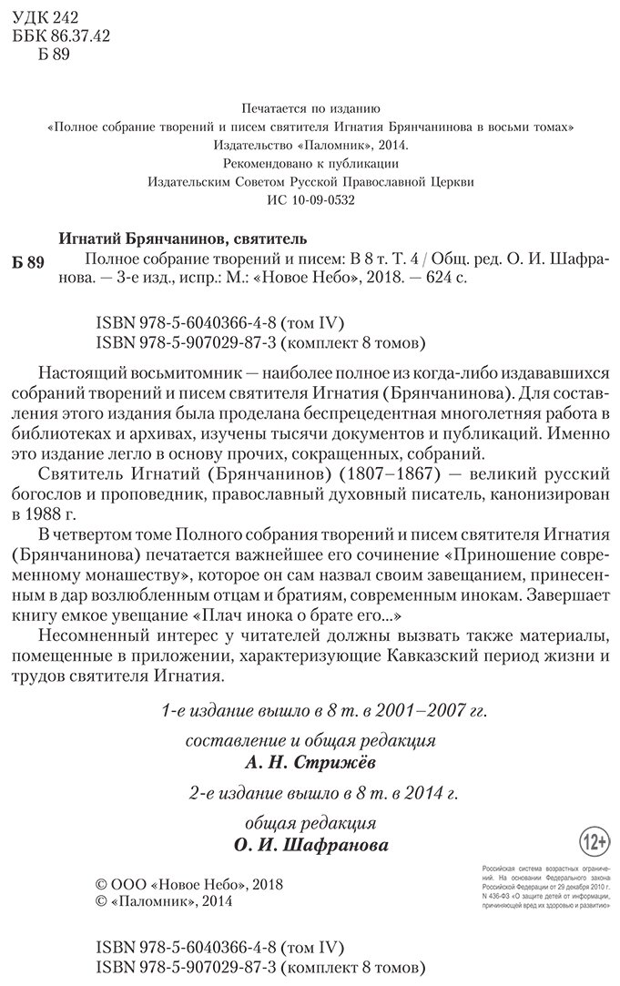 Полное собрание творений и писем святителя Игнатия Брянчанинова в восьми томах. Том 4 (Святитель Игнатий (Брянчанинов)); Новое Небо, 2018