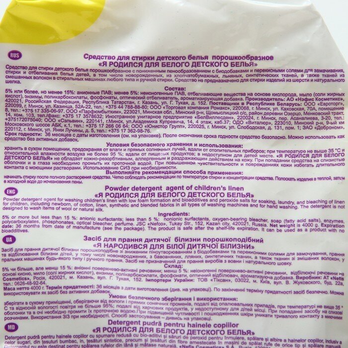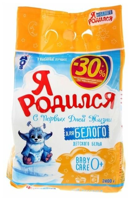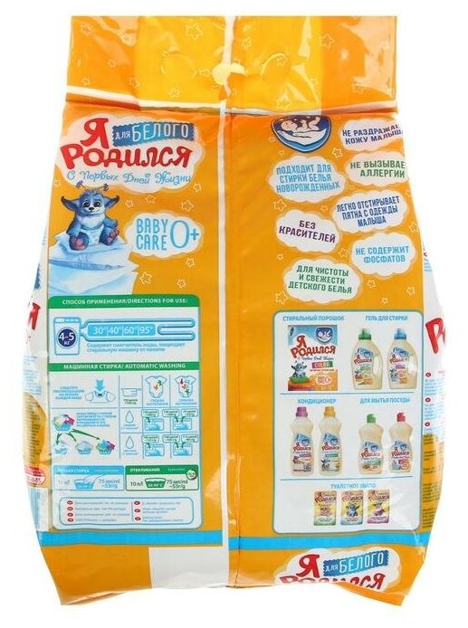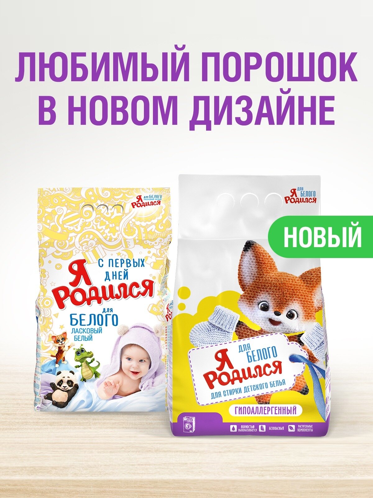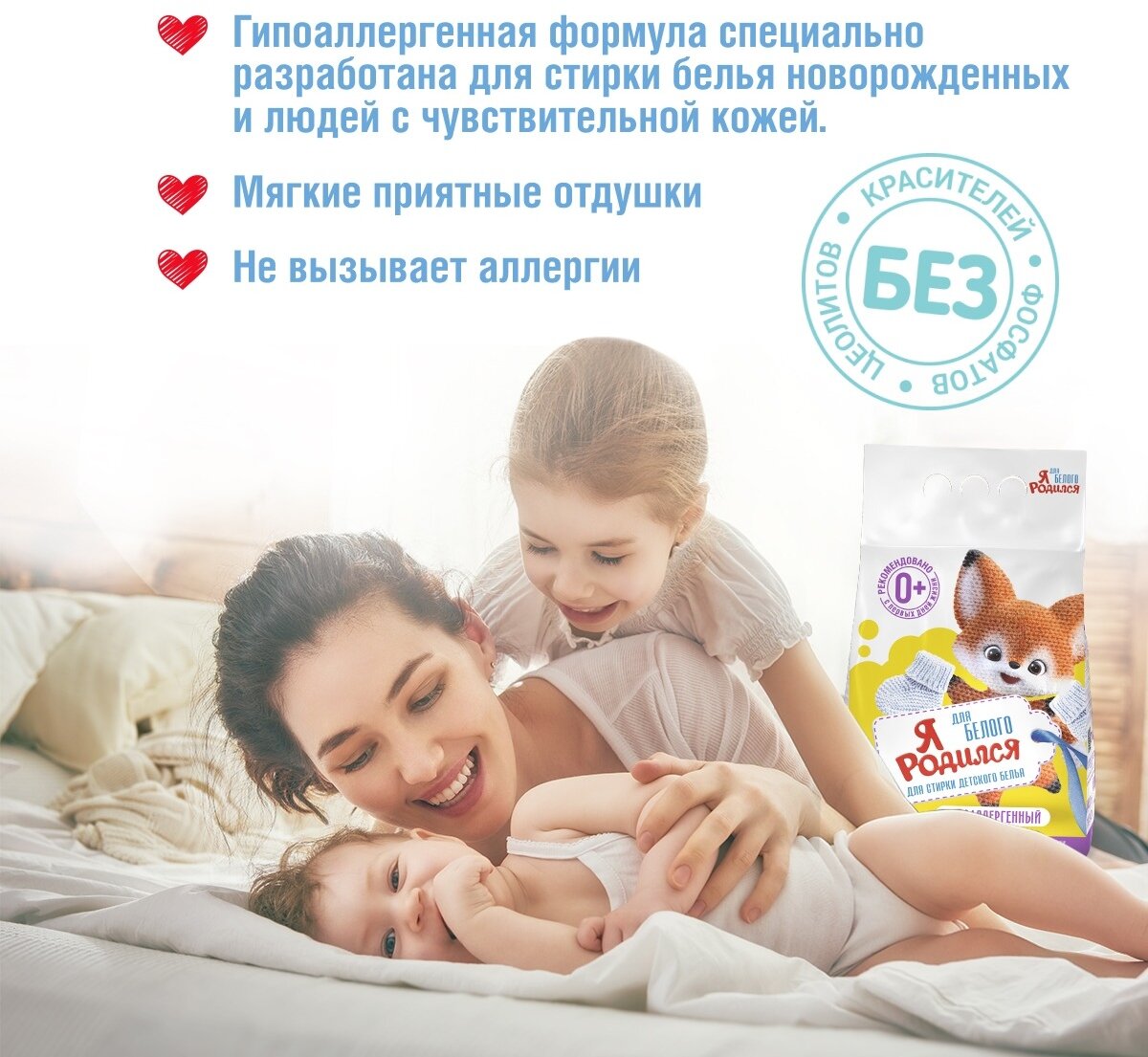 Стиральный порошок «Я родился» отлично подходит для стирки белья новорожденных, легко отстирывает пятна, не раздражают кожу ребенка, сохраняет исходный цвет одежды. Не содержит искусственные красители, консерванты, фосфаты, агрессивные отдушки и отвечает всем принципам безопасности в данном сегменте продуктов.