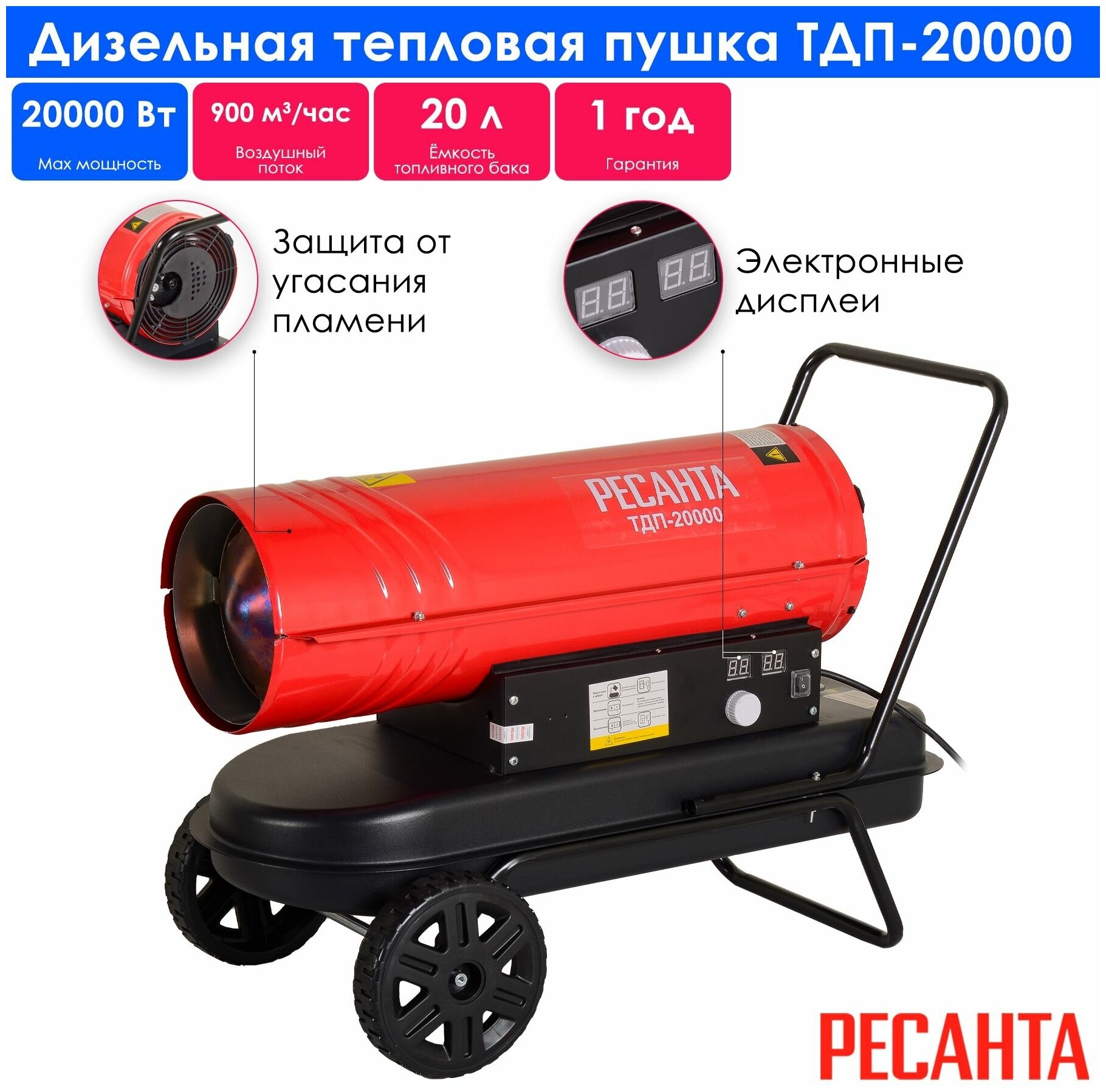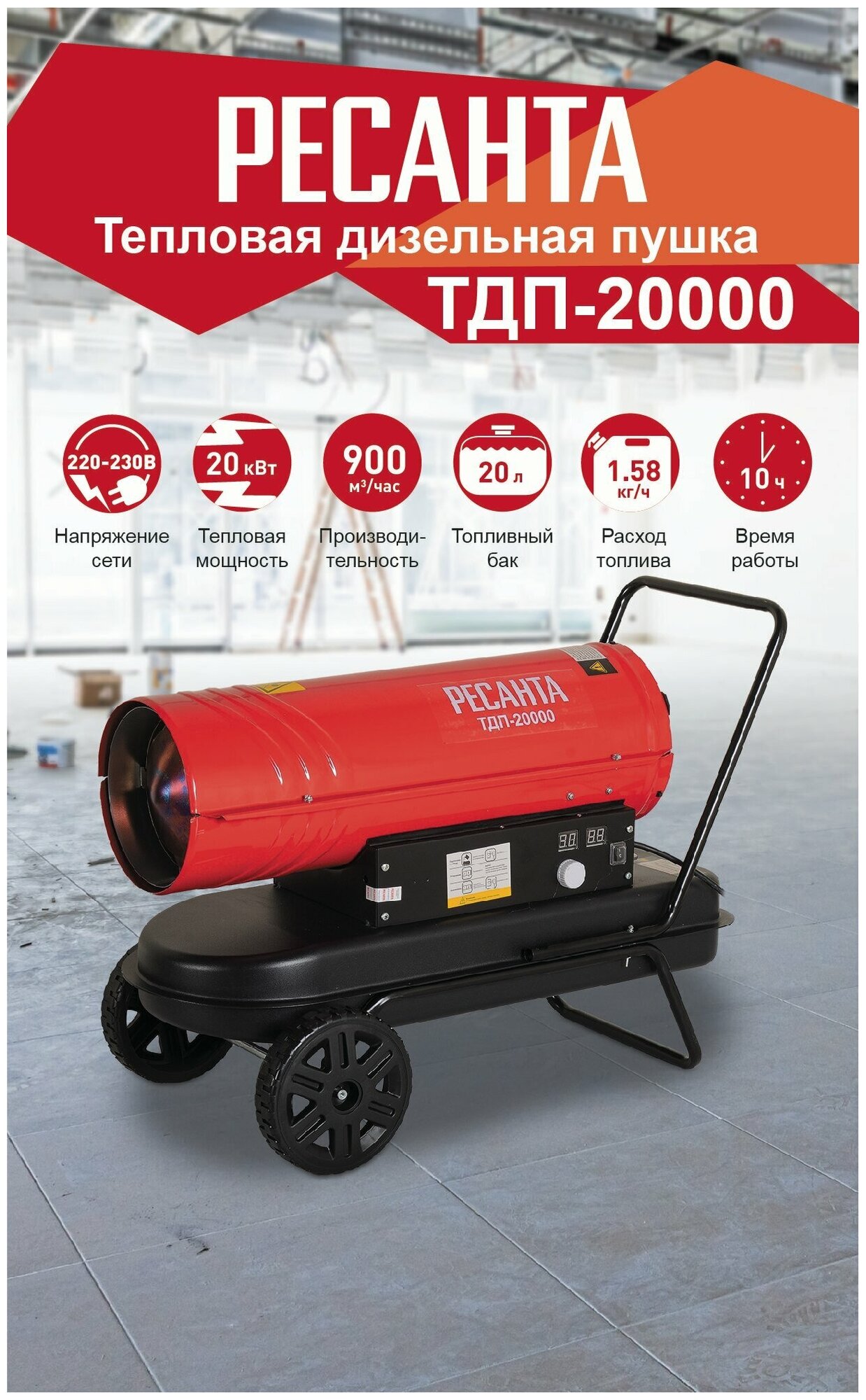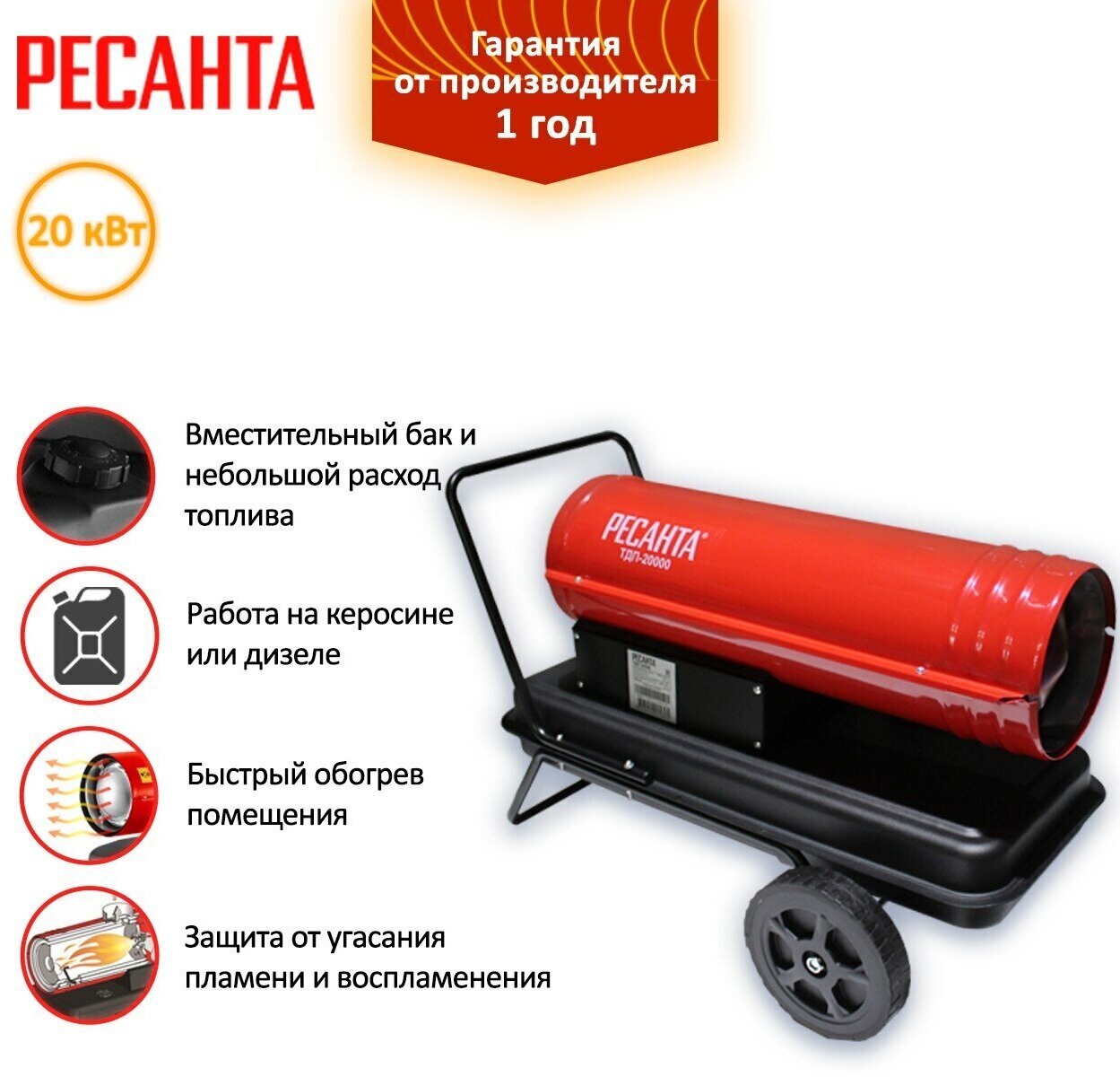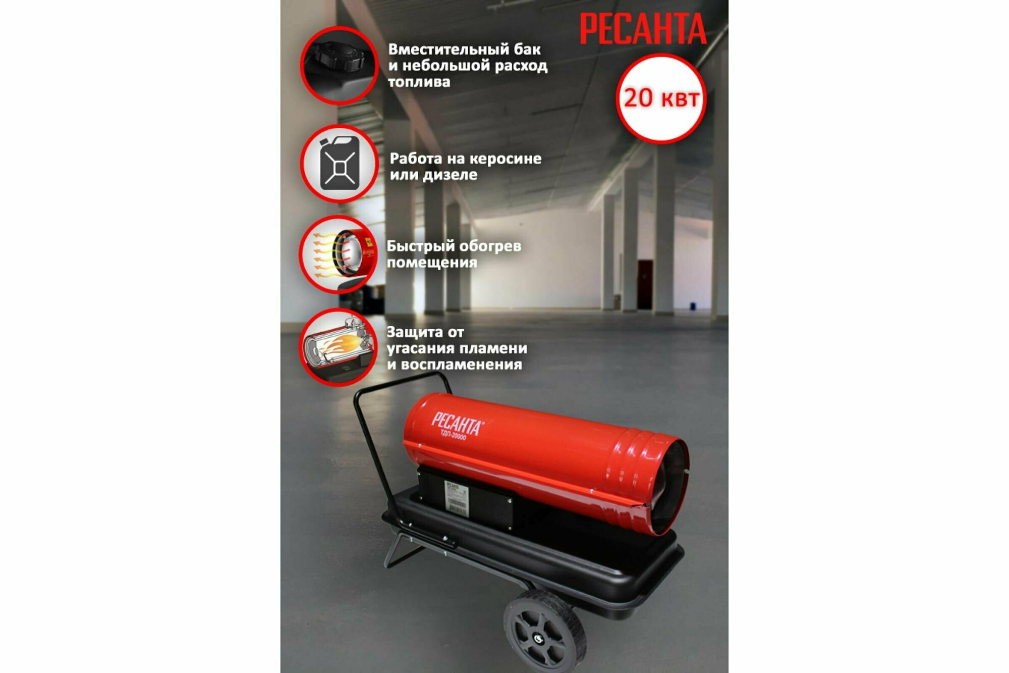 Дизельная тепловая пушка Ресанта предназначена для отопления больших строительных, складских и других помещений. В качестве топлива используется керосин или дизельное топливо. Прибор оснащен защитой от угасания пламени и защитой от воспламенения - для безопасной эксплуатации.
