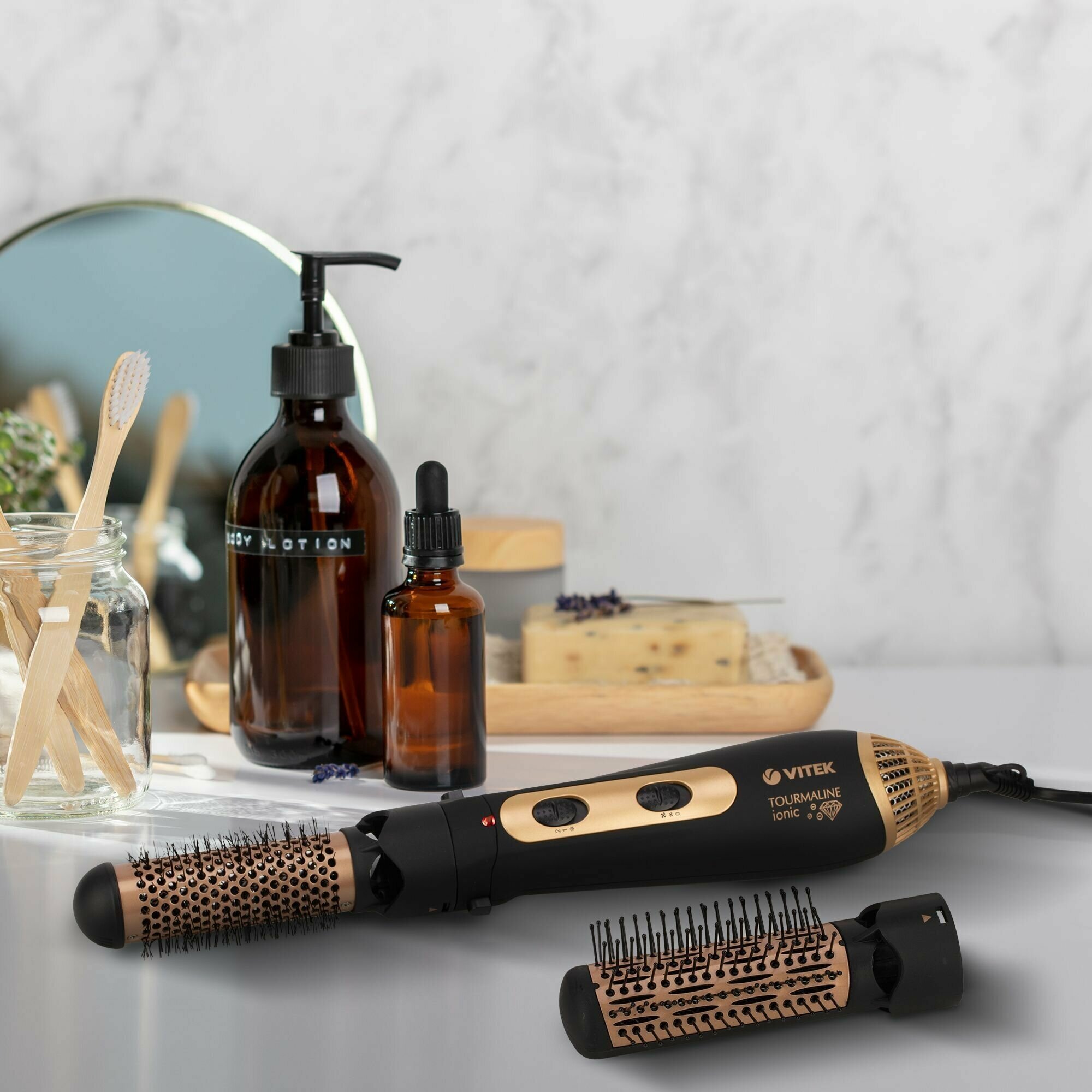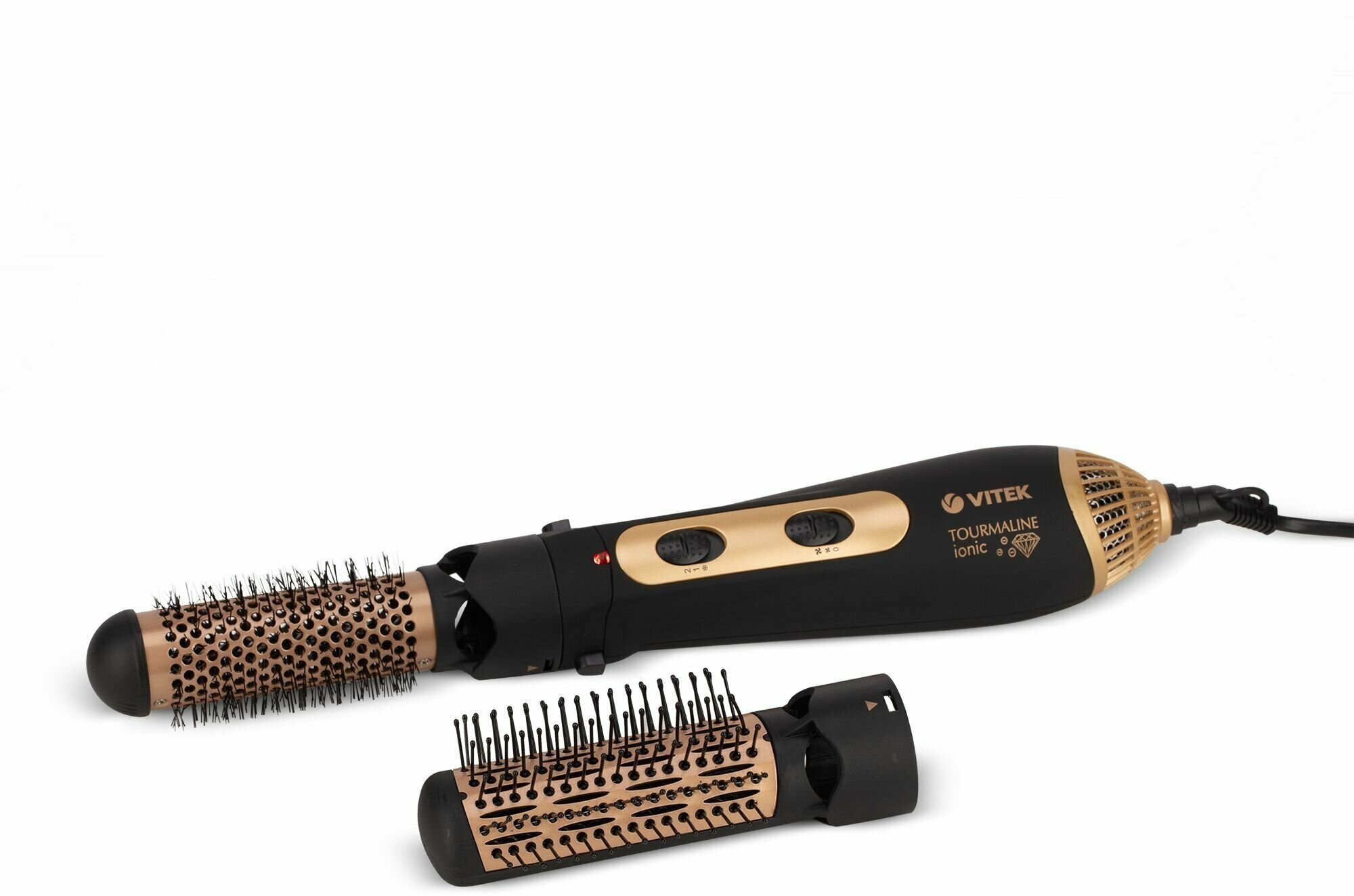 Создание красивой прически возможно не только при качественном уходе за волосами, но и при использовании надежной и функциональной техники. И к числу подобных устройств для укладки волос можно отнести фен-щетку Vitek (BK). Техника нового поколения предоставляет массу возможностей для каждого пользователя. При помощи фена-щетки Vitek (BK) вы не просто высушите волосы, вы сделаете их пышными, объемными, завьете в красивые локоны или сделаете идеально ровными. Щетка не вращается.