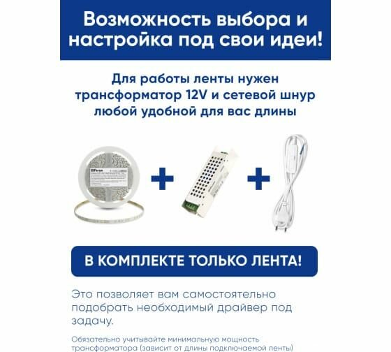 Лента с оптимальным индексом цветопередачи, обеспечивающим естественные и насыщенные цвета.Лента светодиодная 12V FERON LS603, 60*SMD2835, 4,8W/m, IP20, 3000К (теплый белый), Кратность резки мм 50мм, 5000 *8 *1.22мм