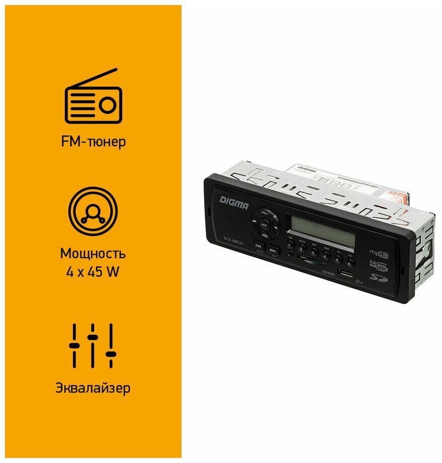 Автопроигрыватель Digma . Данная модель воспроизводит чтение аудиофайлов формата MP3. Встроенный усилитель располагает четырьмя каналами максимальной выходной мощностью 4х45 Вт, поэтому позволит насладиться чистым и мощным звуком музыкальных композиций. Встроенный высокочувствительный FM-тюнер всегда будет радовать точно настроенной волной любимой радиостанции.