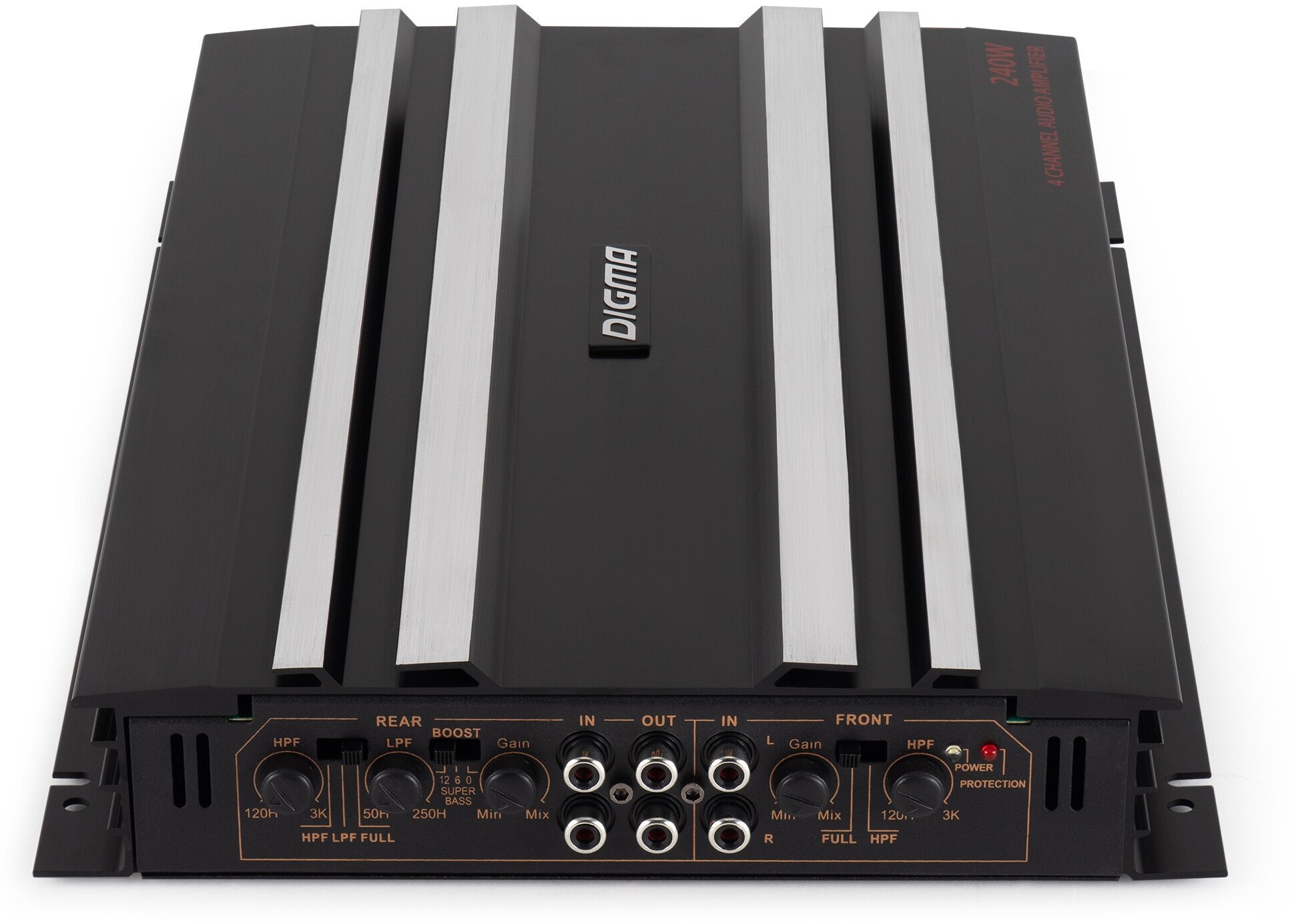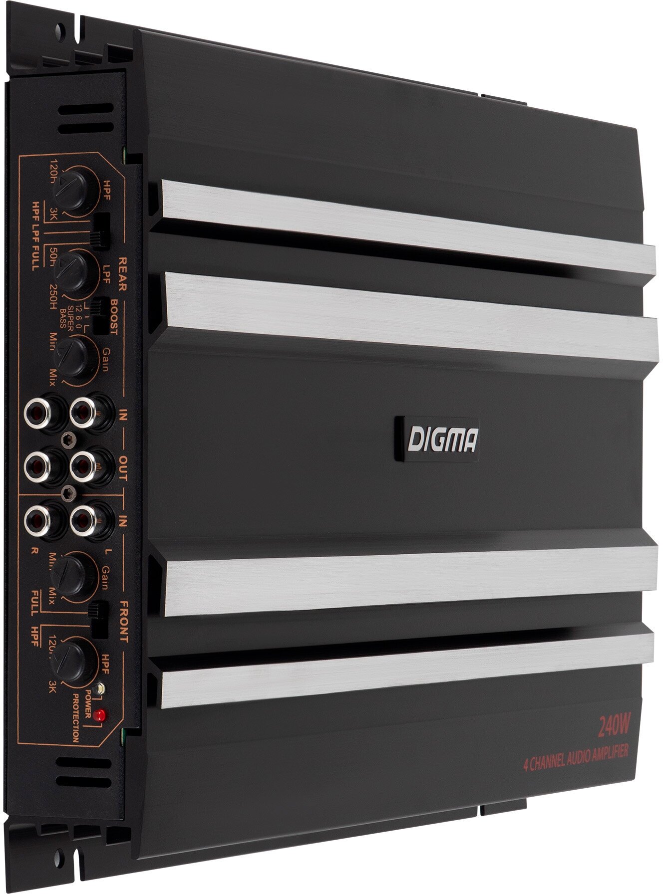 Усилитель Digma является четырехканальным усилителем, который имеет функцию мостового режима. Соотношение между сигналом и шумом равно 70 дБ. Диапазон частот воспроизведения колеблется от 20 до 20 000 Гц.