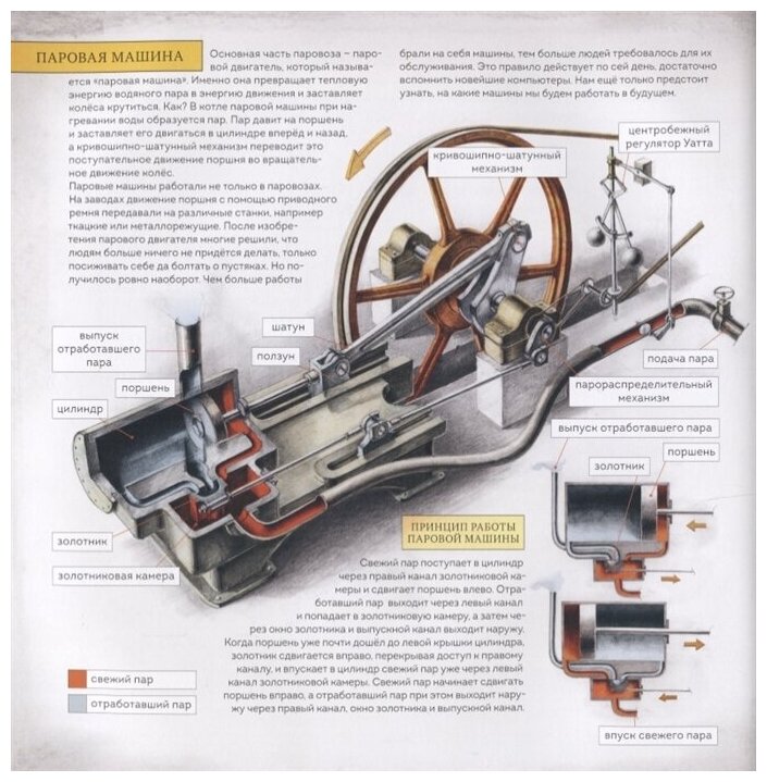 Объяснения технических моментов частично вплетены в ткань рассказа, частично вынесены в отдельные текстовые вставки и поясняющие иллюстрации. Из них вы узнаете про действие пара, принципы работы паровоза, изготовление колёсных пар, функции отдельных механизмов паровоза - например, котла, шатуна, автоматического воздушного тормоза, предохранительного клапана.