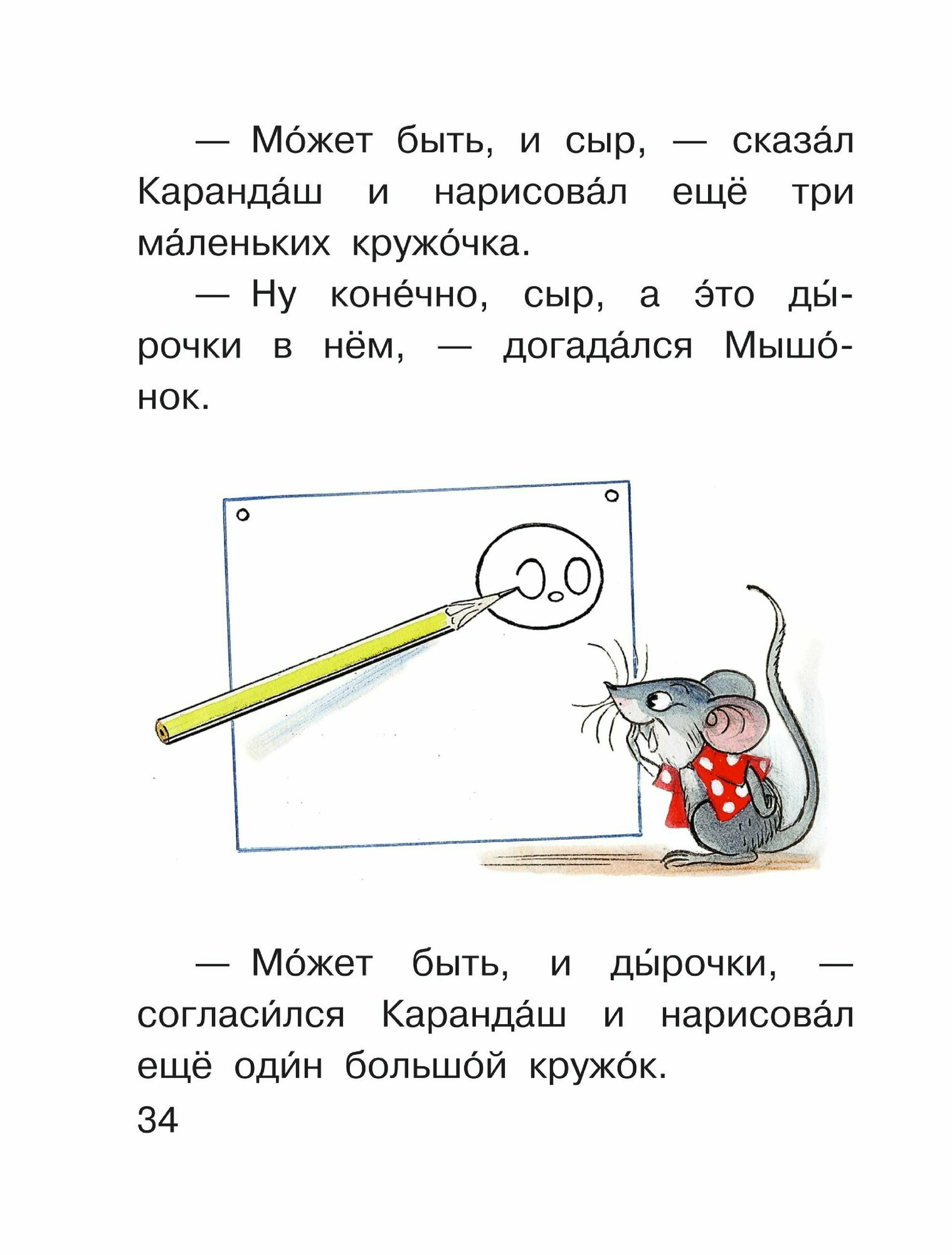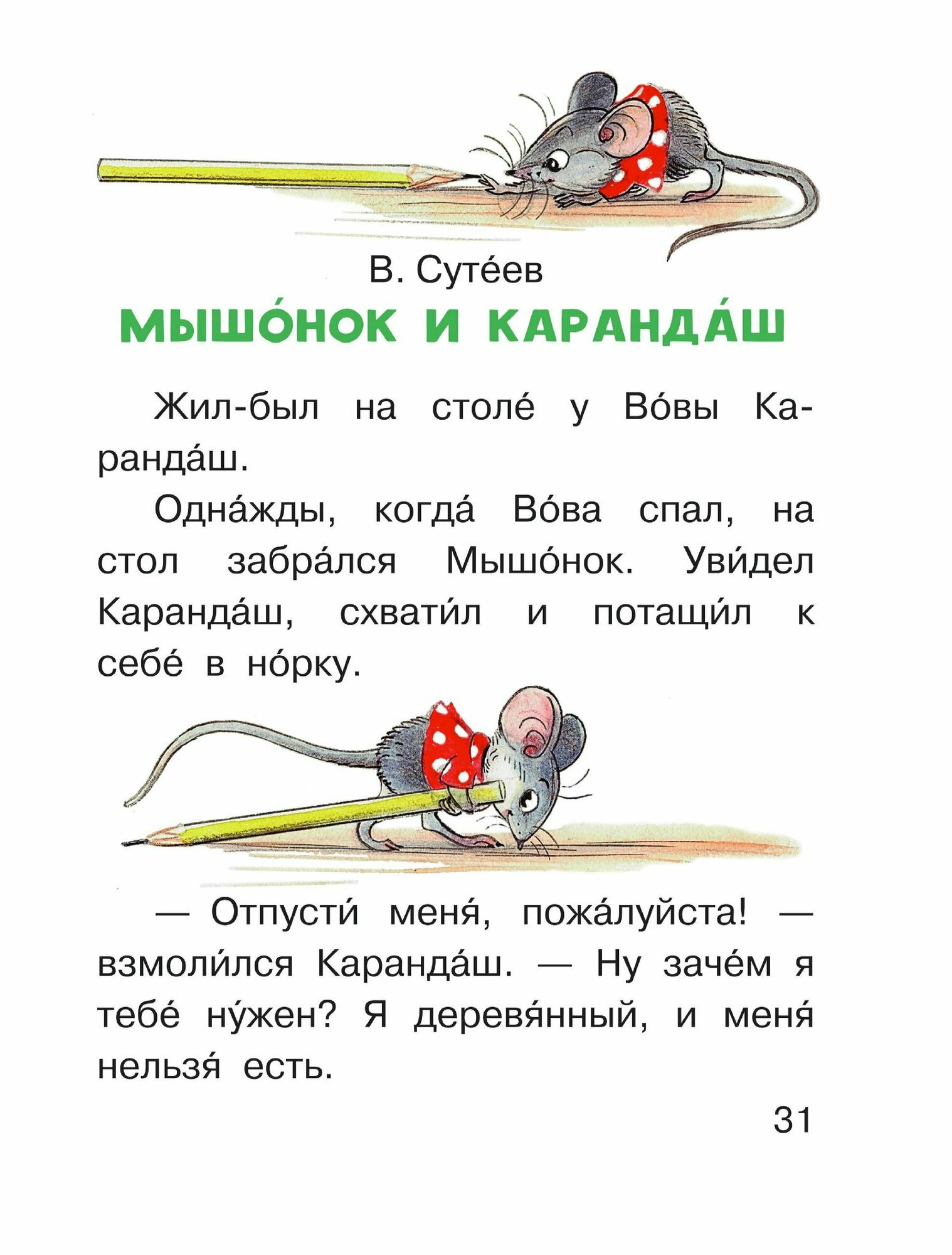 Формат книги очень удобный, мягкая обложка, красивые и яркие иллюстрации. Книга для самостоятельного чтения, но пока читаю сама так, как сыну 2 года. Произведения, представленные в книге, нам очень нравятся, особенно "Мышонок и карандаш". Для нас недостатком является то, что в книге есть целые развороты текста без картинок, на мой взгляд и ребенку, который сам начинает читать тяжело будет прочитать такой объем текста.