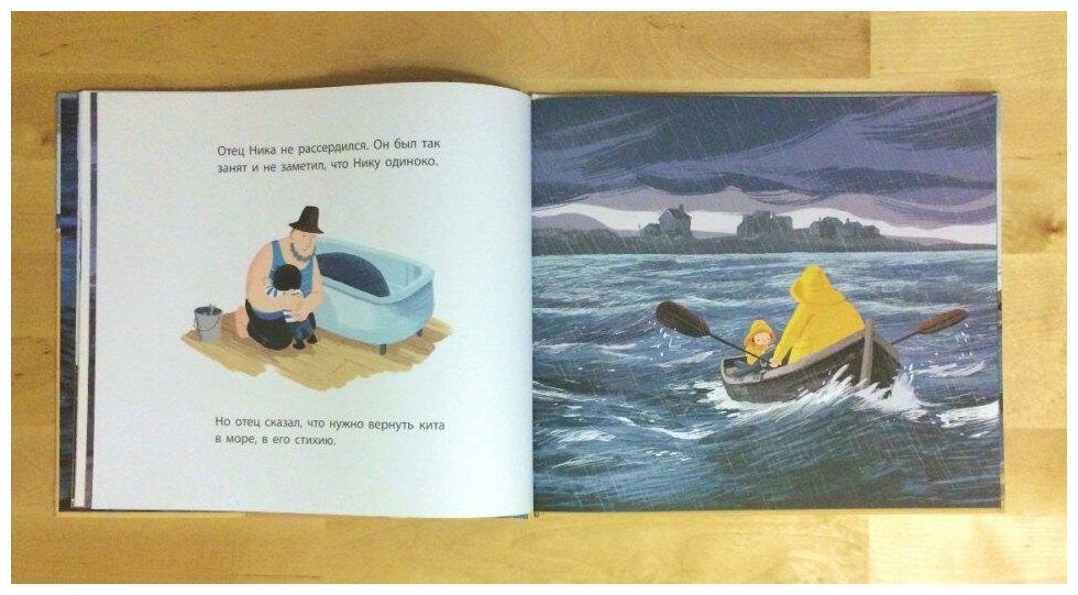 Эту книгу стоит купить, хотя бы для того, чтобы потрогать. Бархатистая, плотная бумага, очень приятные тактильные ощущения! Средний размер и приятный вес, легко держать даже одной рукой в неудобной позе (протестировано неоднократно при вечернем укладывании ребенка). Красивые иллюстрации, приглушенная цветовая гамма, морская тематика и спасение животных - очень много слагаемых успеха) с первого прочтения книга стала любимой у сына (2 года и 7 мес.), текста маловато, поэтому добавляем от себя еще что-то, но это и хорошо для нашего возраста. Интересно искать кошек на картинках) Правда детям сложно, наверное, понять, почему мальчик живет только с папой и тот вечно в море до поздней ночи, тему одиночества так рано поднимать не хочется, ну да для сглаживания текстов есть наша родительская фантазия) Однозначно рекомендуем книгу, хорошее пополнение в мальчиковой коллекции) обратите внимание, у этой книги есть книжка-подружка - "На высоком холме", мы купили сразу обе и очень довольны) и вообще, это издательство плохих книг не делает) книги потрясающие, и детские и взрослые одновременно. Из каждой можно извлечь одну, но очень серьезную мысль, эти книги, несмотря на кажущуюся "детскость", действительно обучают.