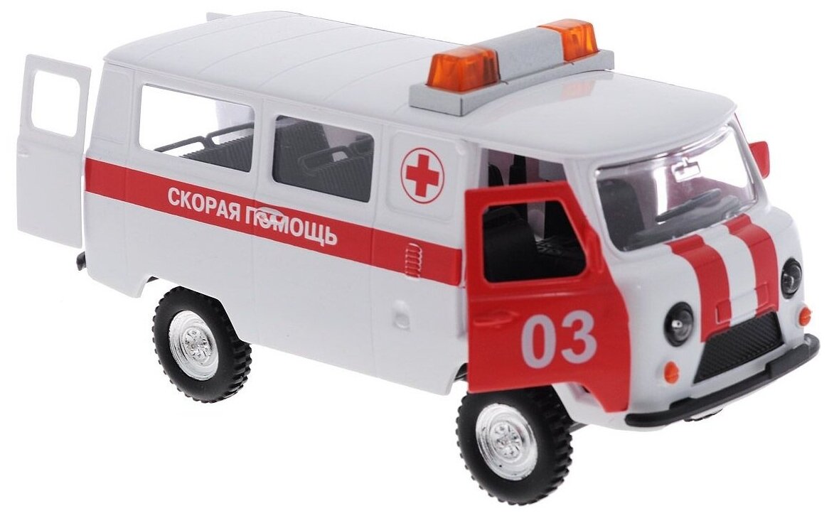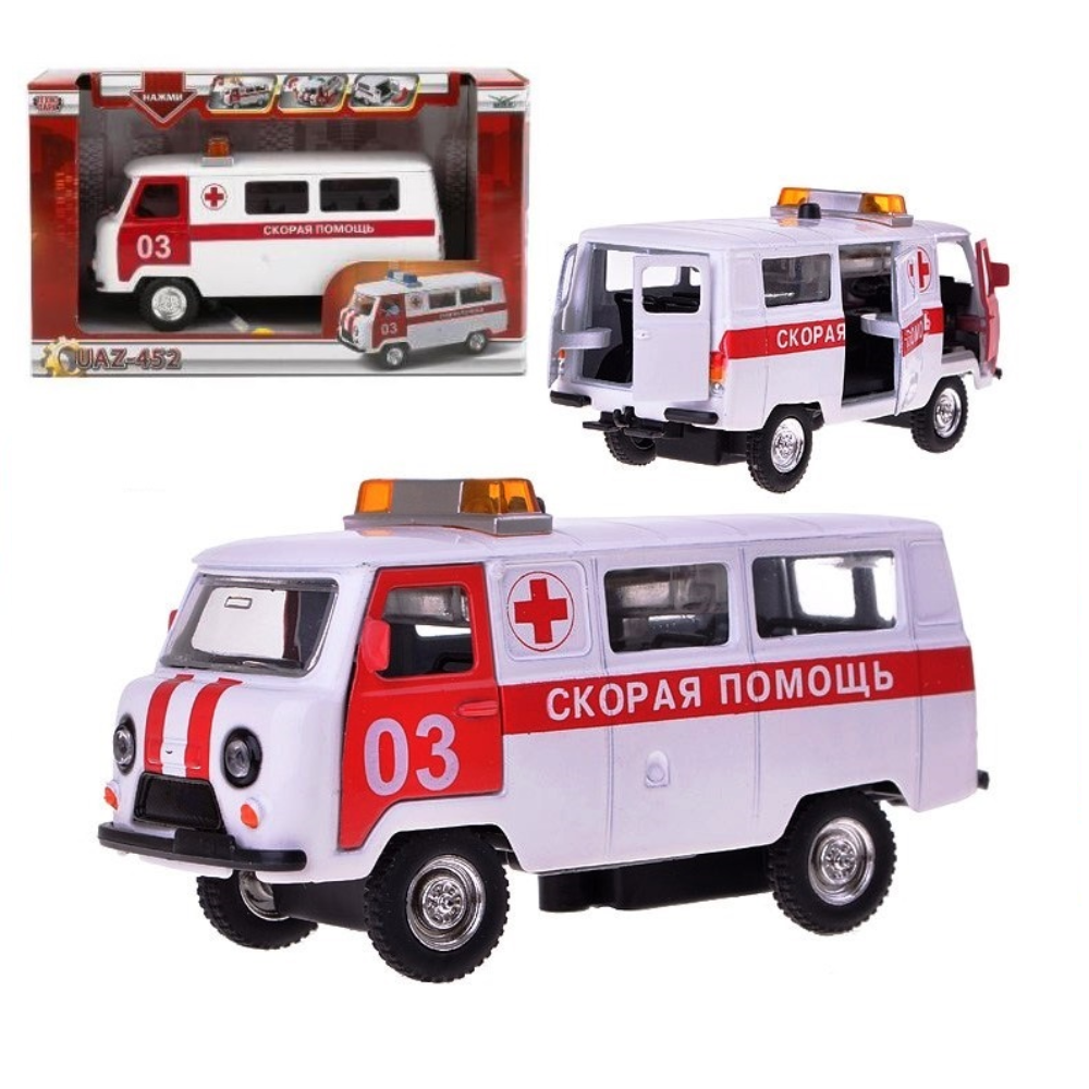 Машинка Скорая помощь, выполненная из пластика и металла, станет любимой игрушкой вашего малыша. Игрушка представляет собой модель автомобиля скорой помощи марки УАЗ 452. Дверцы кабины и багажного отделения открываются. При нажатии на кнопку на крыше модели замигают проблесковые маячки и раздастся звук сирены. Прорезиненные колеса обеспечивают надежное сцепление с любой гладкой поверхностью. Ваш ребенок будет часами играть с этой машинкой, придумывая различные истории. Порадуйте его таким замечательным подарком!