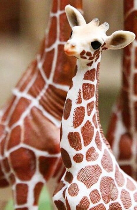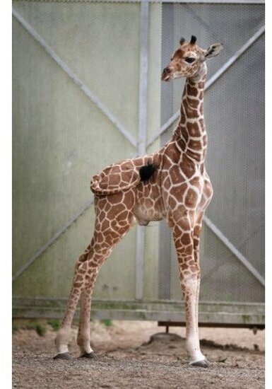 Детеныш жирафа появляется на свет маленьким, беззащитным существом и очень сильно привязан к своим родителям. Внешне детеныш имеет одно важное отличие от взрослой особи — у него нет рожек. Место, где они вырастут, помечено двумя черными пятнышками. У детеныша, как и у взрослой особи, имеется уникальный рисунок пятен. Он никогда не повторяется, как и отпечатки пальцев у человека. По окрасу животного можно определить к какому виду он принадлежит.